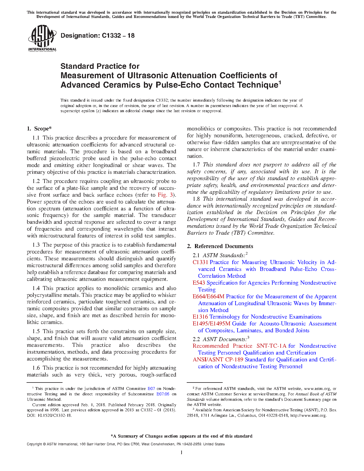 1.1 This test method describes a procedure for measurement of ultrasonic attenuation coefficients for advanced structural ceramic materials. The procedure is based on a broadband buffered piezoelectric probe used in the pulse-echo contact mode and emitting either longitudinal or shear waves. The primary objective of this test method is materials characterization.