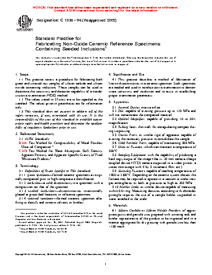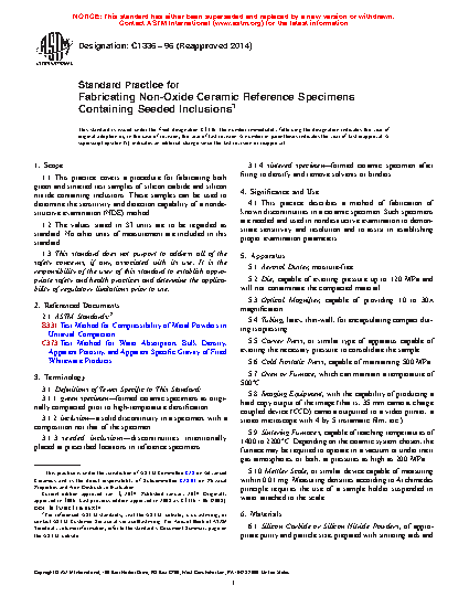 1.1 This practice covers a procedure for fabricating both green and sintered test samples of silicon carbide and silicon nitride containing inclusions. These samples can be used to determine the sensitivity and detection capability of a nondestructive examination (NDE) method.