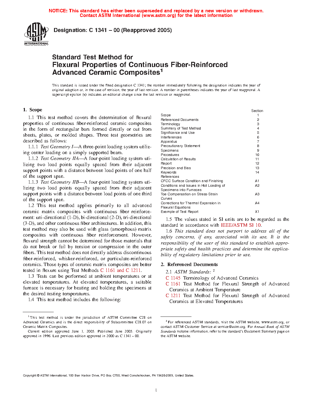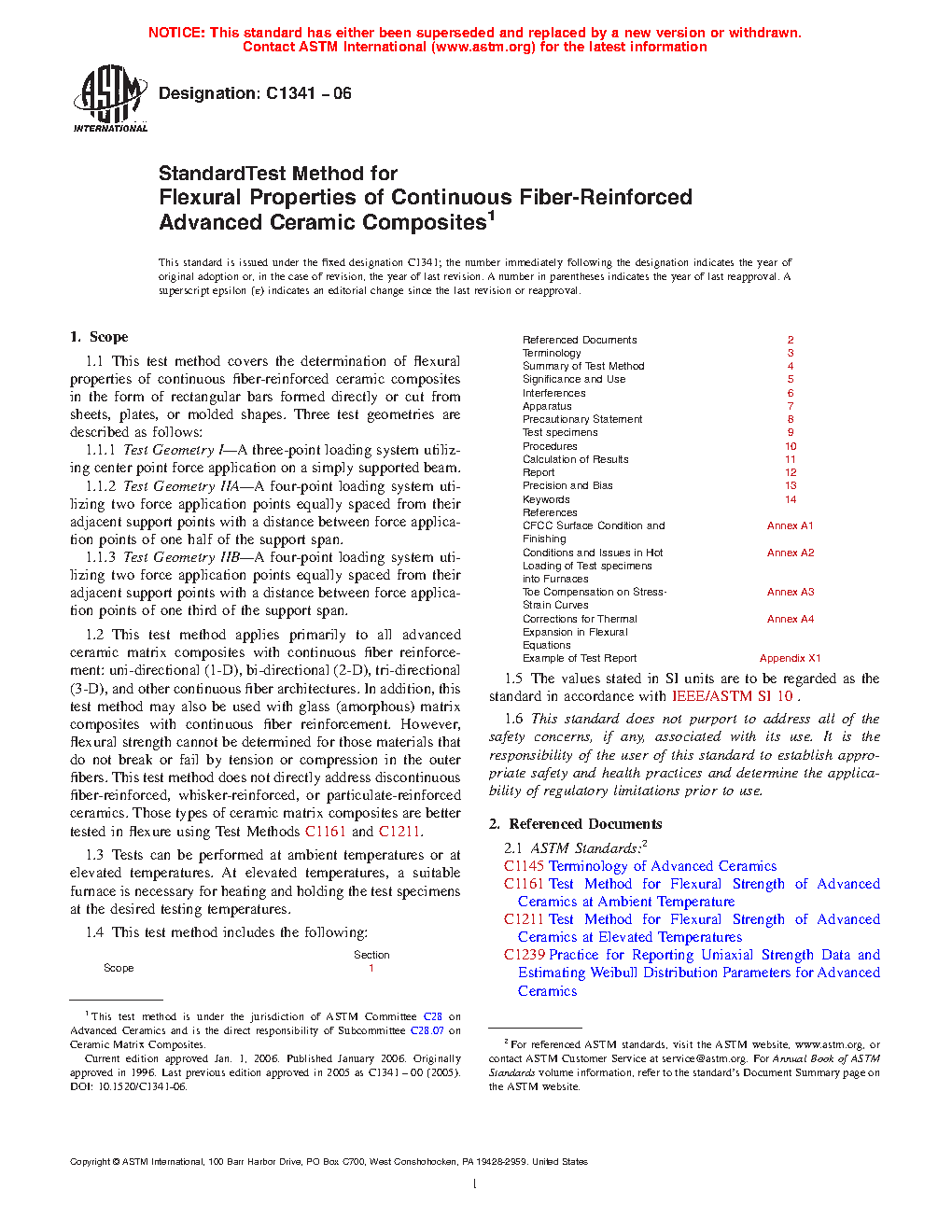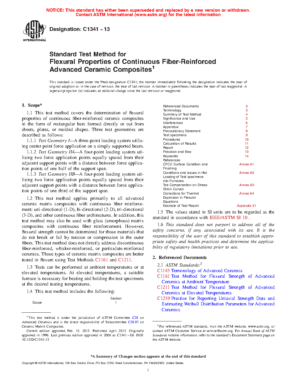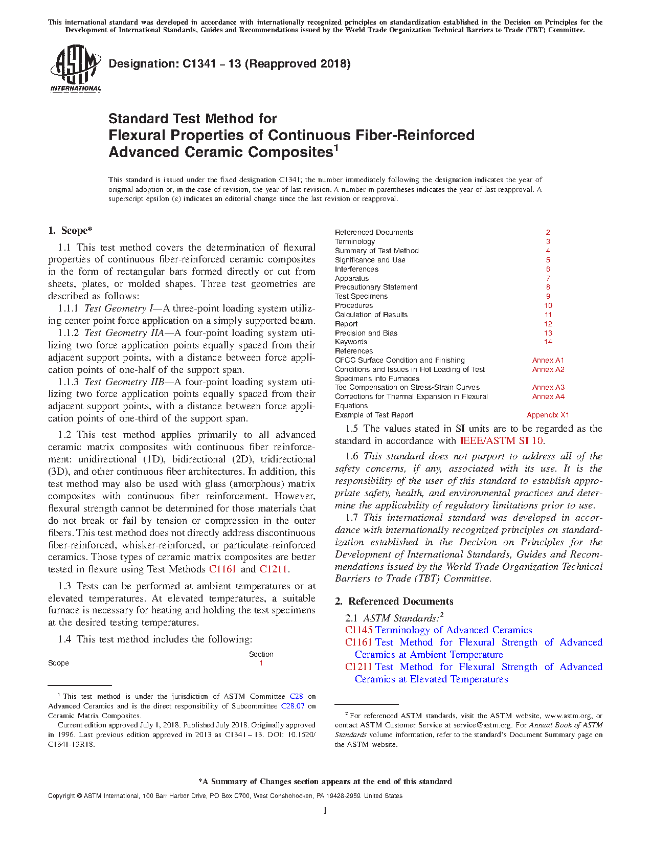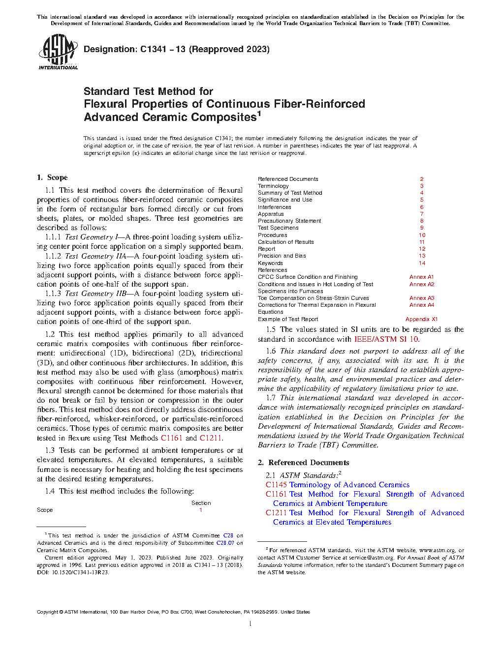 1.2 This test method applies primarily to all advanced ceramic matrix composites with continuous fiber reinforcement: unidirectional (1D), bidirectional (2D), tridirectional (3D), and other continuous fiber architectures. In addition, this test method may also be used with glass (amorphous) matrix composites with continuous fiber reinforcement. However, flexural strength cannot be determined for those materials that do not break or fail by tension or compression in the outer fibers. This test method does not directly address discontinuous fiber-reinforced, whisker-reinforced, or particulate-reinforced ceramics. Those types of ceramic matrix composites are better tested in flexure using Test Methods C1161 and C1211.
