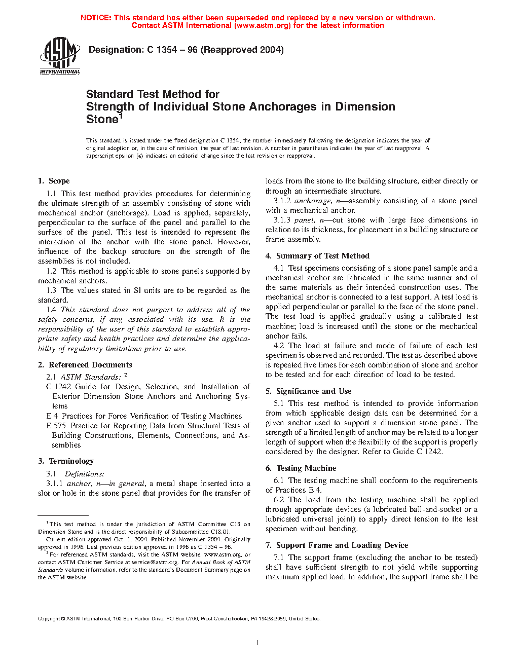 1.1 This test method provides procedures for determining the ultimate strength of an assembly consisting of stone with mechanical anchor (anchorage). Load is applied, separately, perpendicular to the surface of the panel and parallel to the surface of the panel. This test is intended to represent the interaction of the anchor with the stone panel. However, influence of the backup structure on the strength of the assemblies is not included.