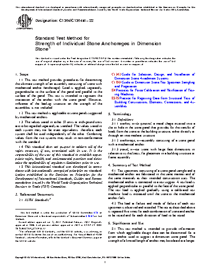 1.1 This test method provides procedures for determining the ultimate strength of an assembly consisting of stone with mechanical anchor (anchorage). Load is applied, separately, perpendicular to the surface of the panel and parallel to the surface of the panel. This test is intended to represent the interaction of the anchor with the stone panel. However, influence of the backup structure on the strength of the assemblies is not included.