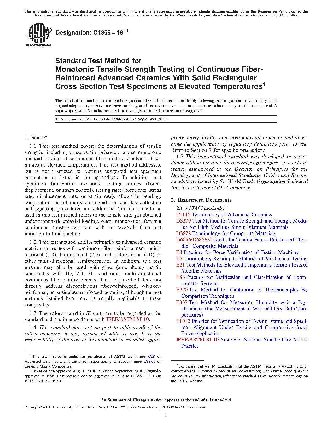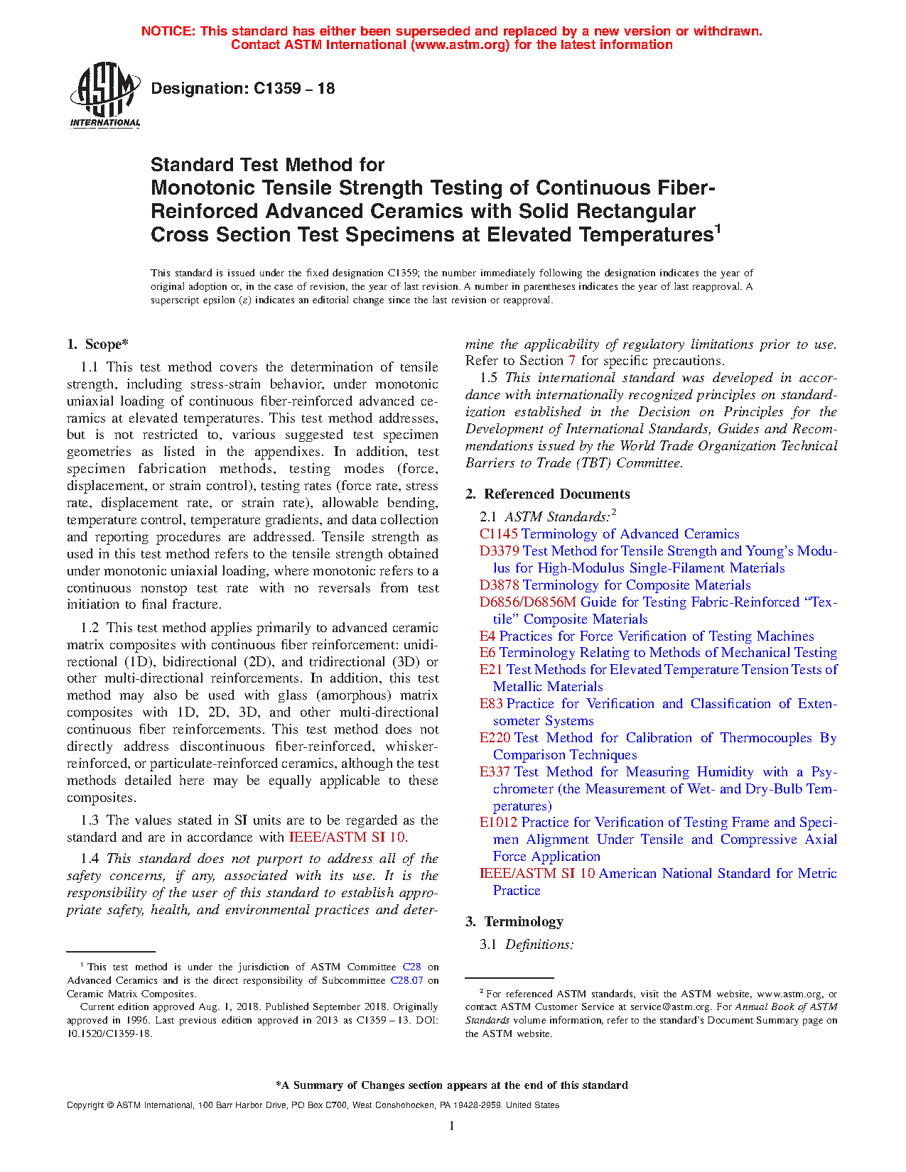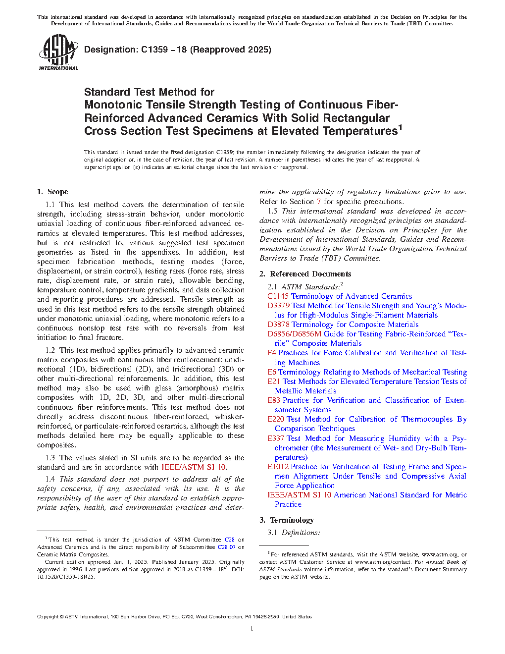1.1 This test method covers the determination of tensile strength, including stress-strain behavior, under monotonic uniaxial loading of continuous fiber-reinforced advanced ceramics at elevated temperatures. This test method addresses, but is not restricted to, various suggested test specimen geometries as listed in the appendixes. In addition, test specimen fabrication methods, testing modes (force, displacement, or strain control), testing rates (force rate, stress rate, displacement rate, or strain rate), allowable bending, temperature control, temperature gradients, and data collection and reporting procedures are addressed. Tensile strength as used in this test method refers to the tensile strength obtained under monotonic uniaxial loading, where monotonic refers to a continuous nonstop test rate with no reversals from test initiation to final fracture.