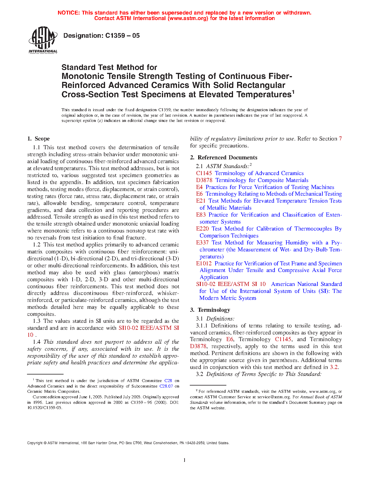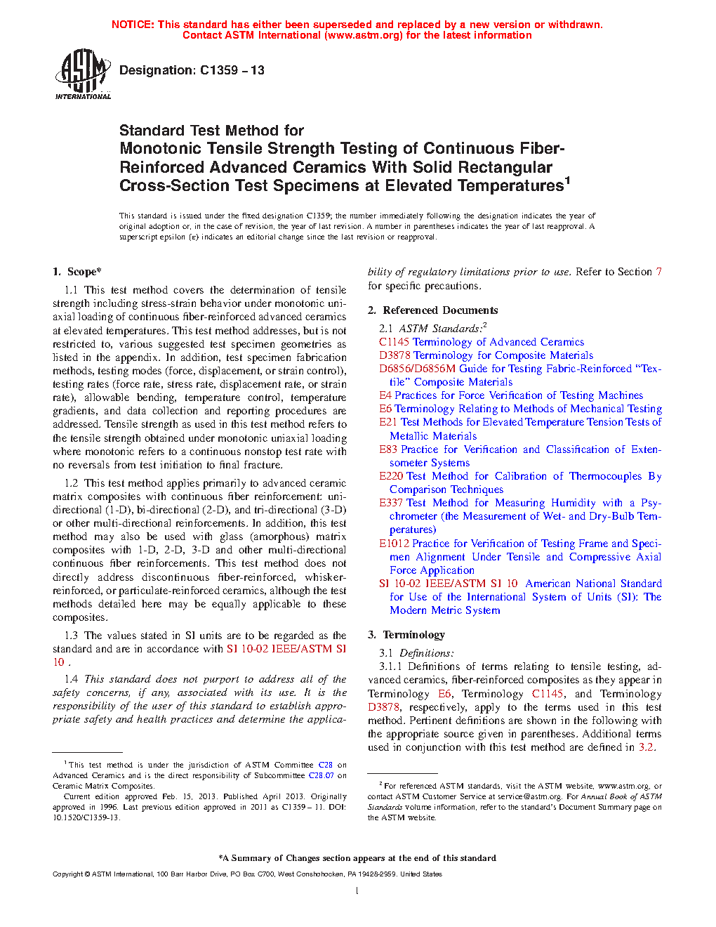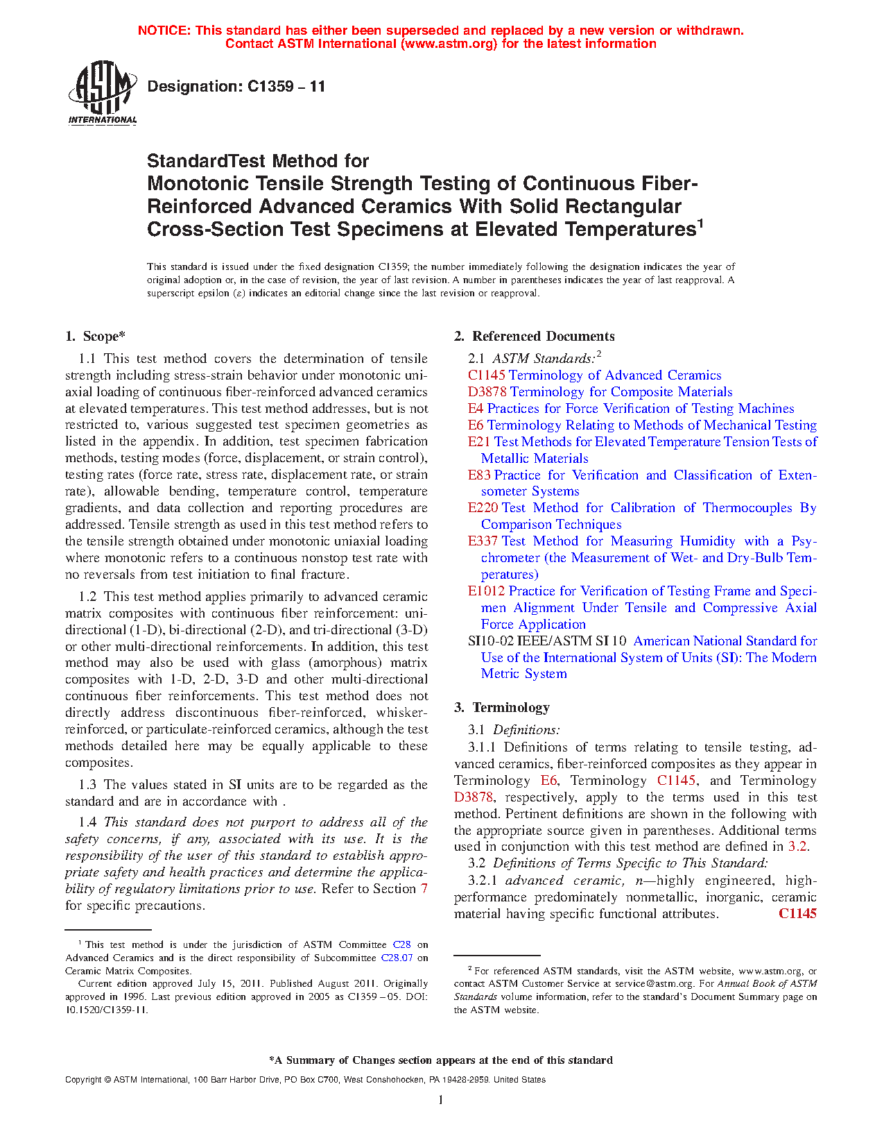 1.1 This test method covers the determination of tensile strength, including stress-strain behavior, under monotonic uniaxial loading of continuous fiber-reinforced advanced ceramics at elevated temperatures. This test method addresses, but is not restricted to, various suggested test specimen geometries as listed in the appendixes. In addition, test specimen fabrication methods, testing modes (force, displacement, or strain control), testing rates (force rate, stress rate, displacement rate, or strain rate), allowable bending, temperature control, temperature gradients, and data collection and reporting procedures are addressed. Tensile strength as used in this test method refers to the tensile strength obtained under monotonic uniaxial loading, where monotonic refers to a continuous nonstop test rate with no reversals from test initiation to final fracture.