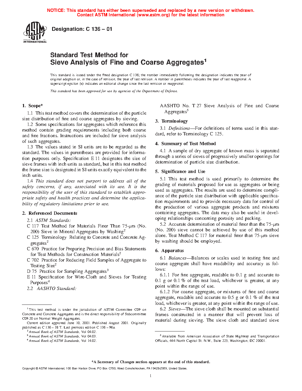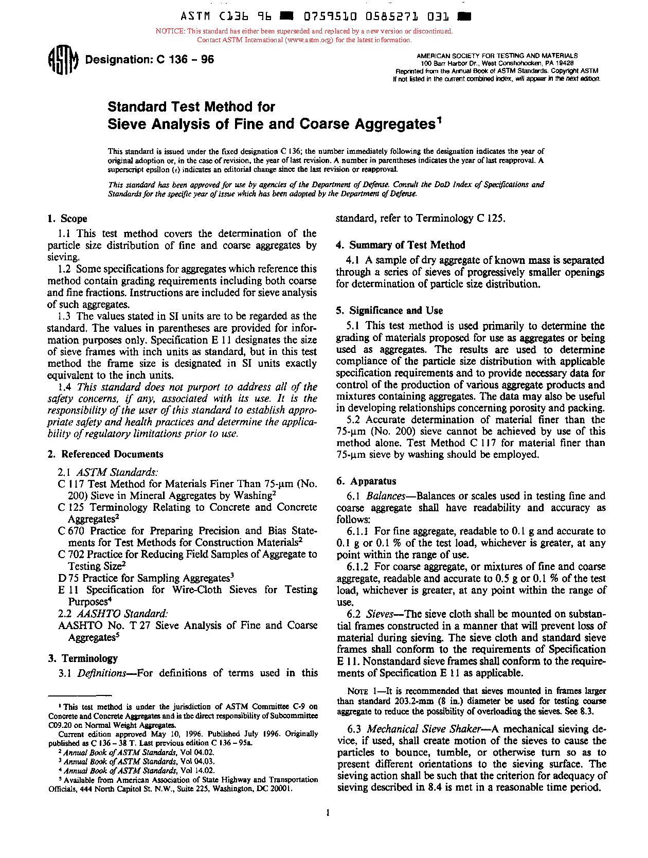 1.1 This test method covers the determination of the particle size distribution of fine and coarse aggregates by sieving.