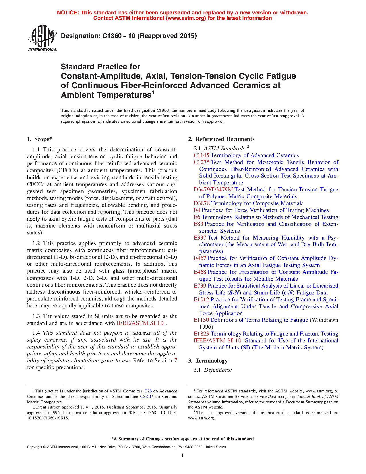 1.1 This practice covers the determination of constant-amplitude, axial tension-tension cyclic fatigue behavior and performance of continuous fiber-reinforced advanced ceramic composites (CFCCs) at ambient temperatures. This practice builds on experience and existing standards in tensile testing CFCCs at ambient temperatures and addresses various suggested test specimen geometries, specimen fabrication methods, testing modes (force, displacement, or strain control), testing rates and frequencies, allowable bending, and procedures for data collection and reporting. This practice does not apply to axial cyclic fatigue tests of components or parts (that is, machine elements with nonuniform or multiaxial stress states).