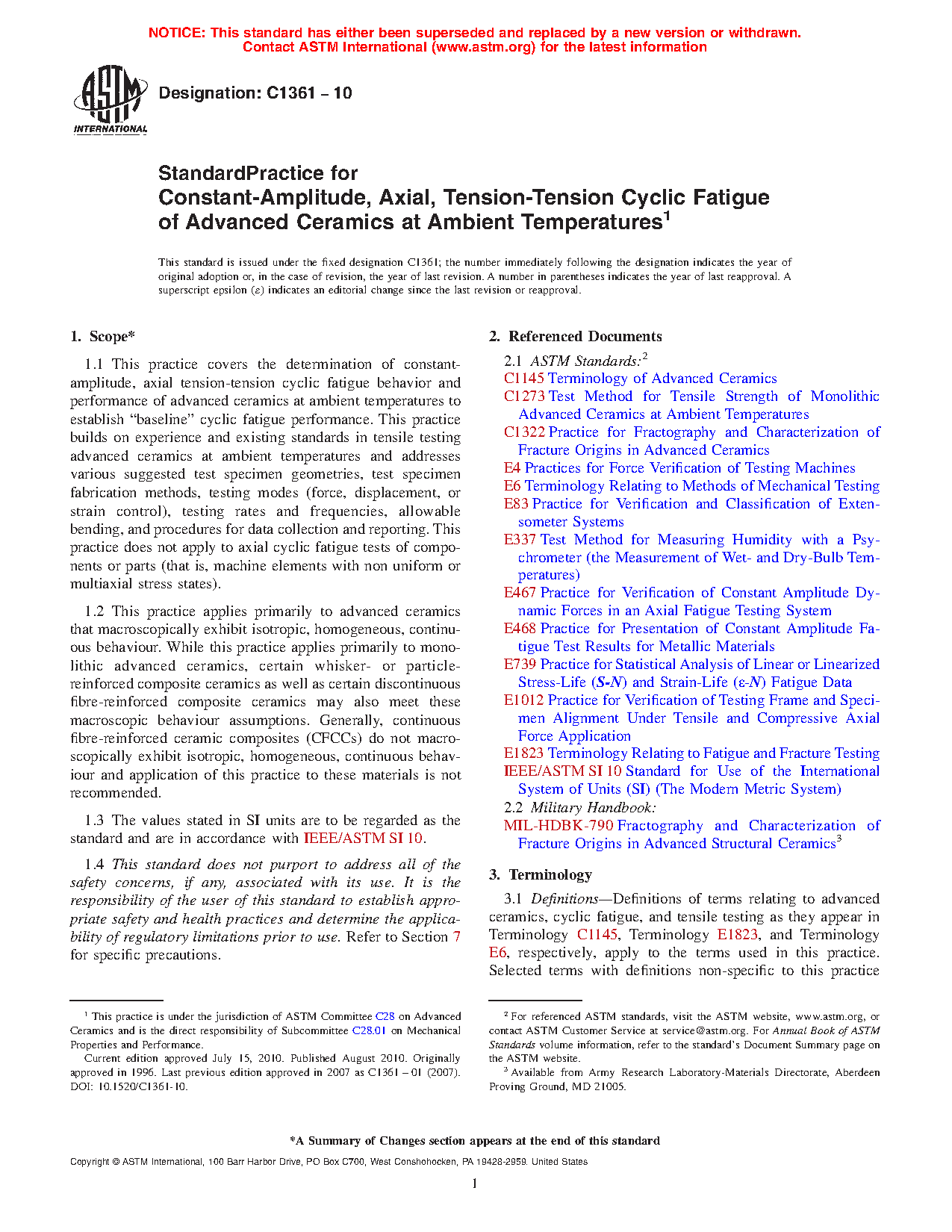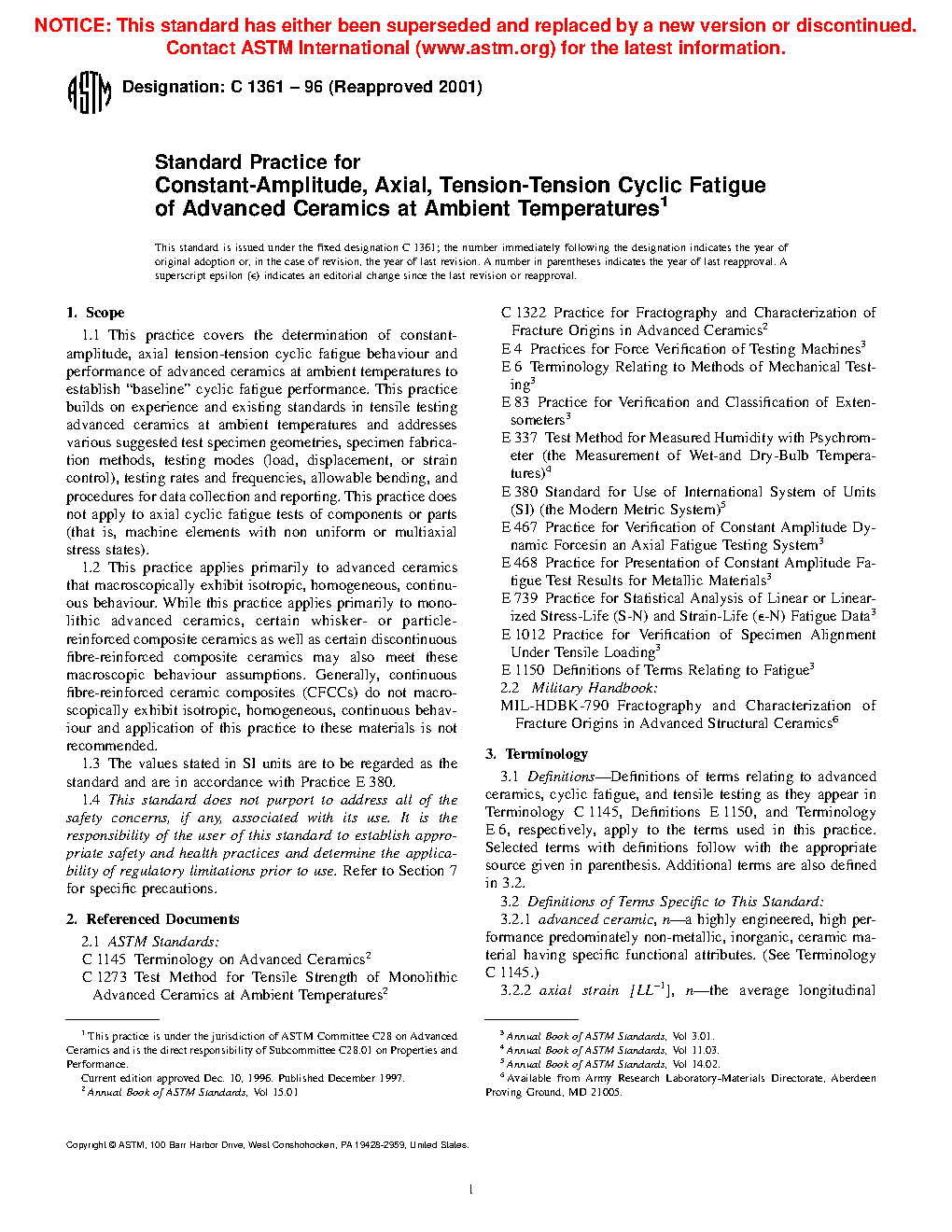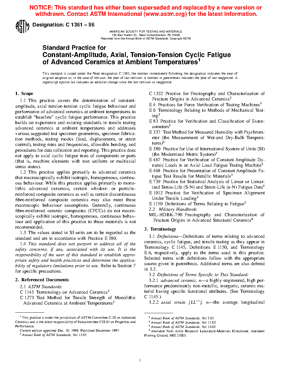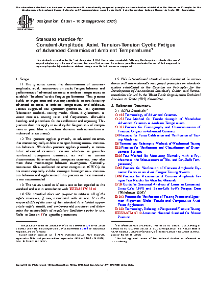 1.1 This practice covers the determination of constant-amplitude, axial tension-tension cyclic fatigue behaviour and performance of advanced ceramics at ambient temperatures to establish "baseline" cyclic fatigue performance. This practice builds on experience and existing standards in tensile testing advanced ceramics at ambient temperatures and addresses various suggested test specimen geometries, specimen fabrication methods, testing modes (load, displacement, or strain control), testing rates and frequencies, allowable bending, and procedures for data collection and reporting. This practice does not apply to axial cyclic fatigue tests of components or parts (that is, machine elements with non uniform or multiaxial stress states).