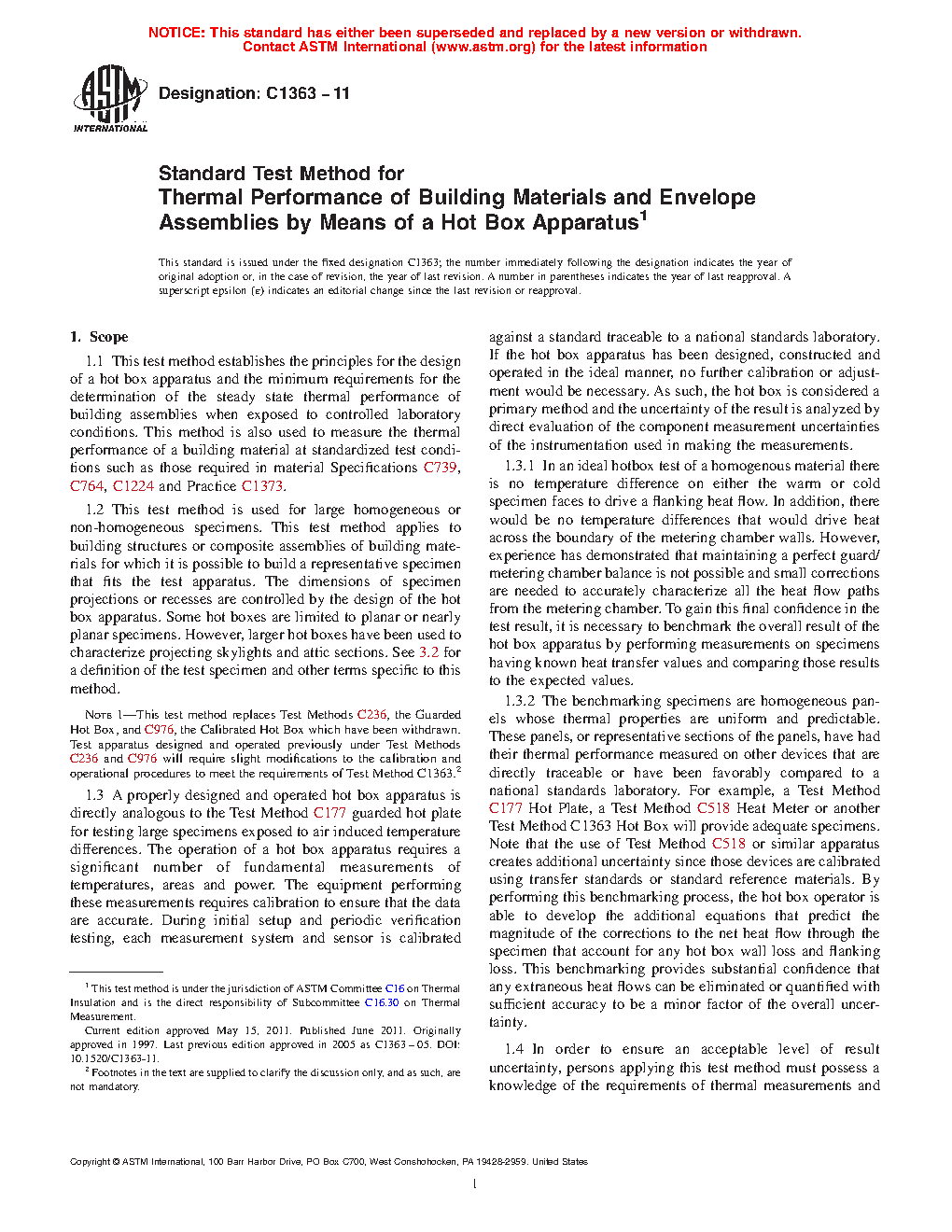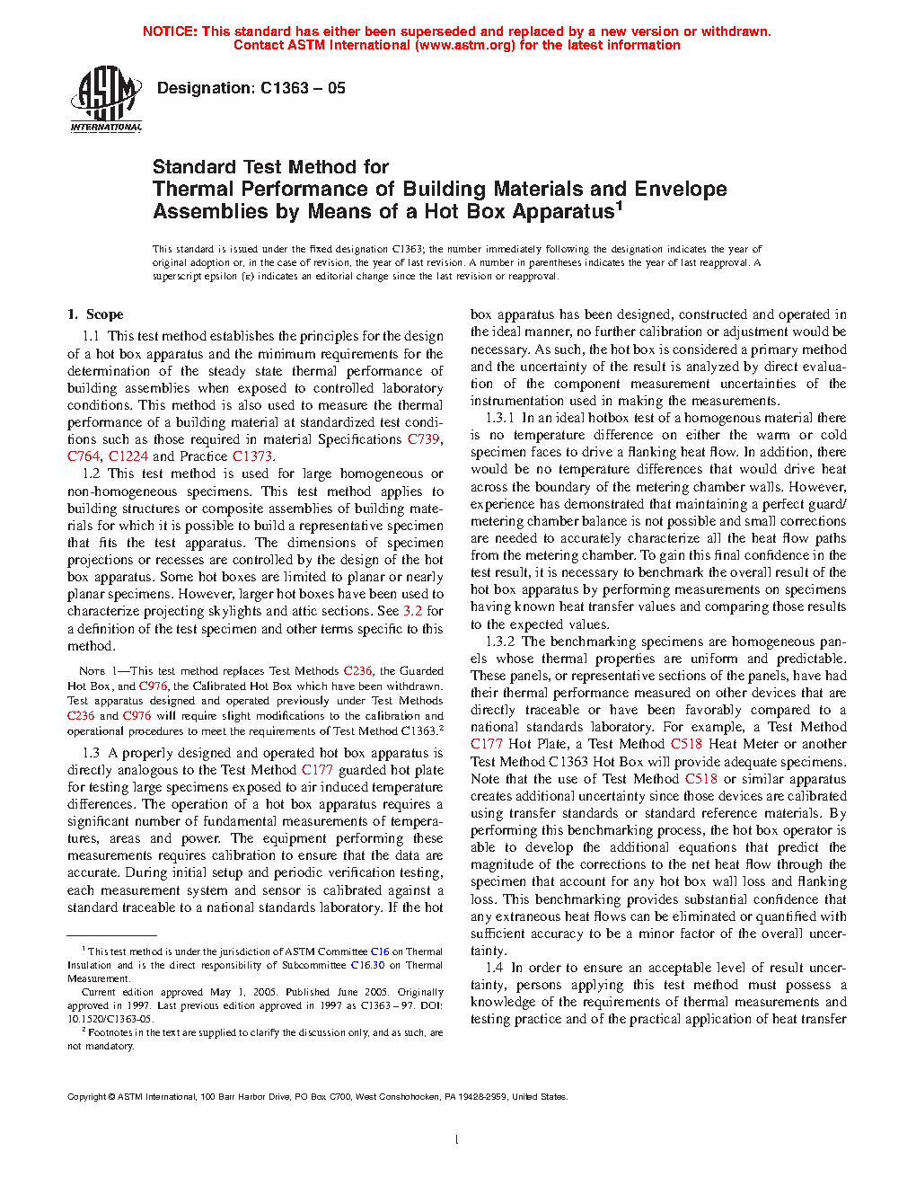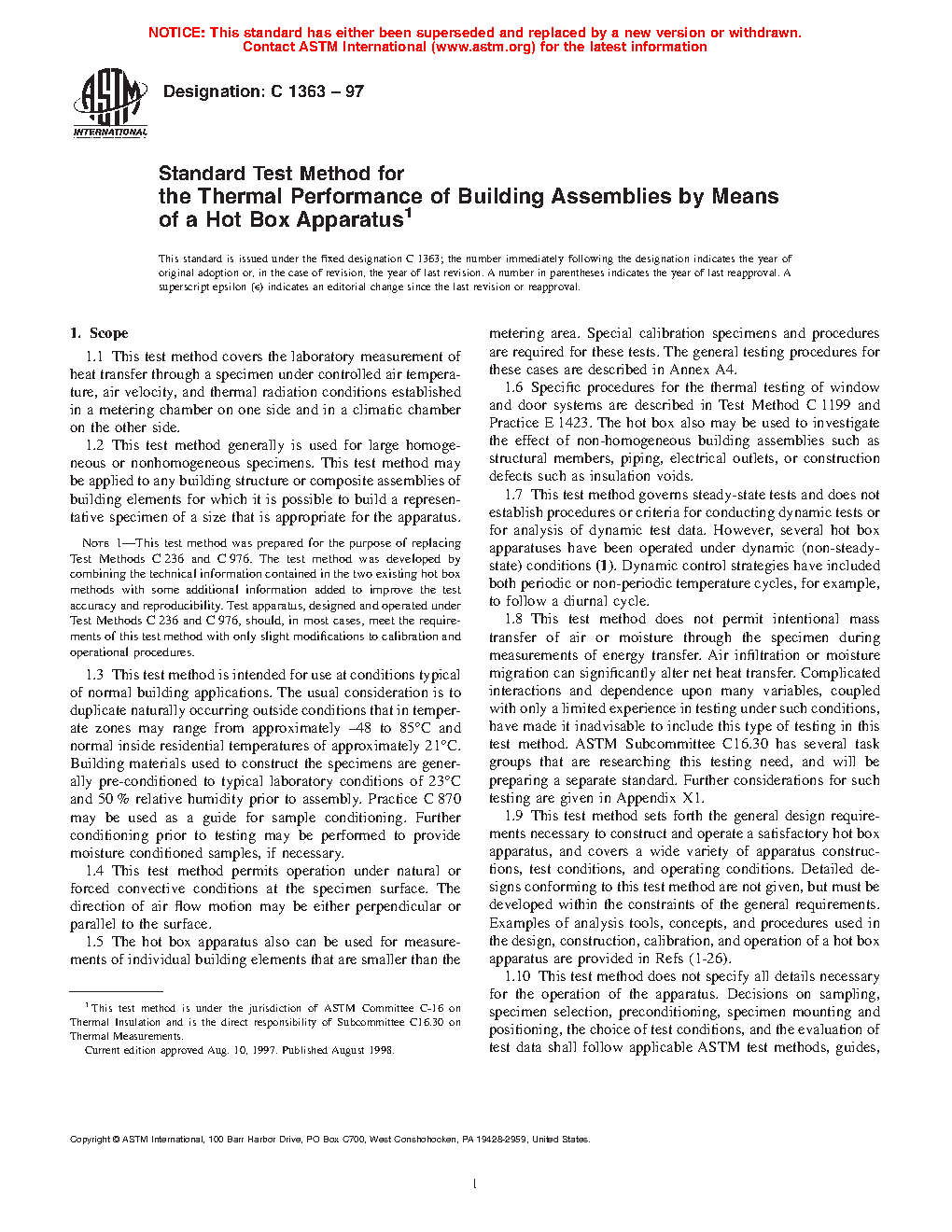 Note 1—This test method replaces Test Methods C236, the Guarded Hot Box, and C976, the Calibrated Hot Box which have been withdrawn. Test apparatus designed and operated previously under Test Methods C236 and C976 will require slight modifications to the calibration and operational procedures to meet the requirements of Test Method C1363.