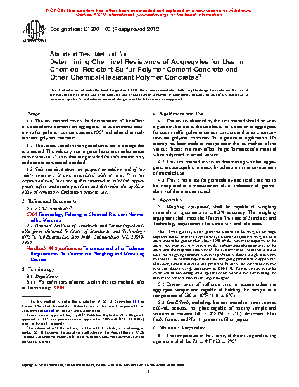 Standard Test Method for Determining the Chemical Resistance of Aggregates for Use in Chemical-Resistant Sulfur Polymer Cement Concrete and Other Chemical-Resistant Polymer Concretes