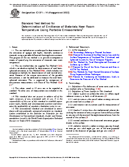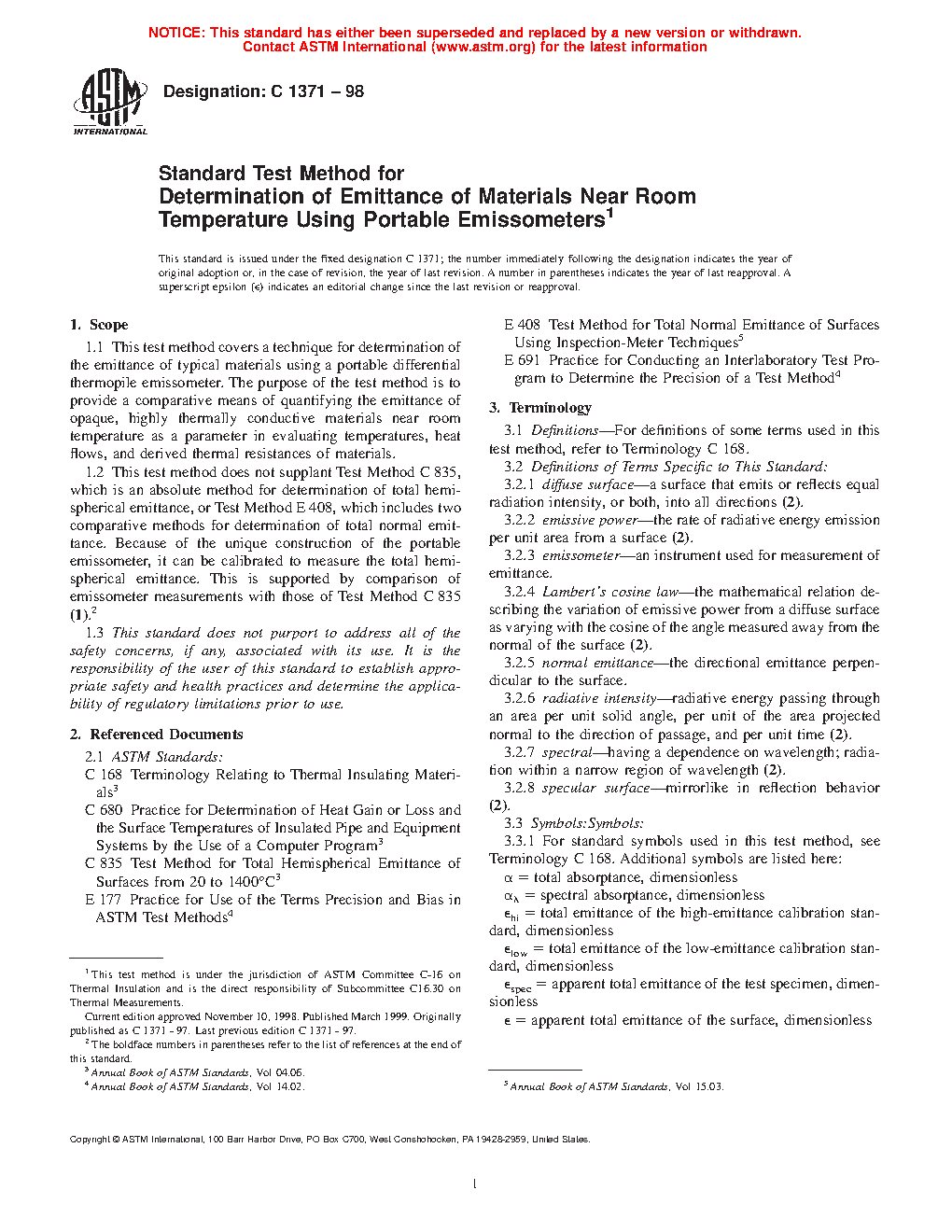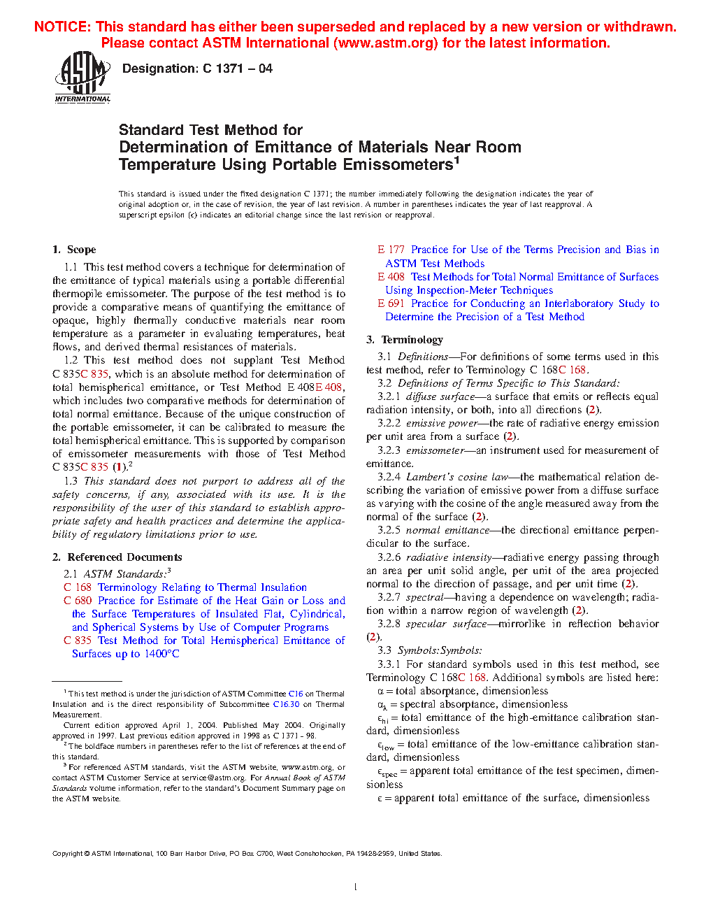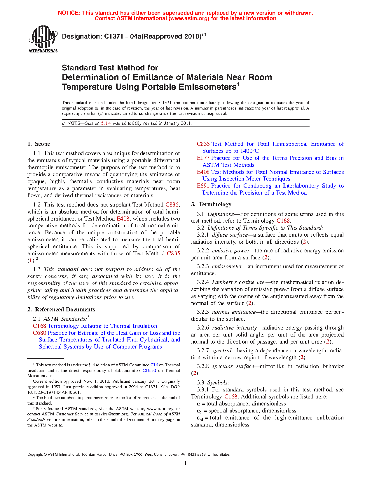 1.2 This test method does not supplant Test Method C835, which is an absolute method for determination of total hemispherical emittance, or Test Method E408, which includes two comparative methods for determination of total normal emittance. Because of the unique construction of the portable emissometer, it can be calibrated to measure the total hemispherical emittance. This is supported by comparison of emissometer measurements with those of Test Method C835 (1).2