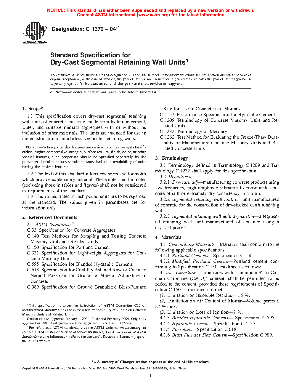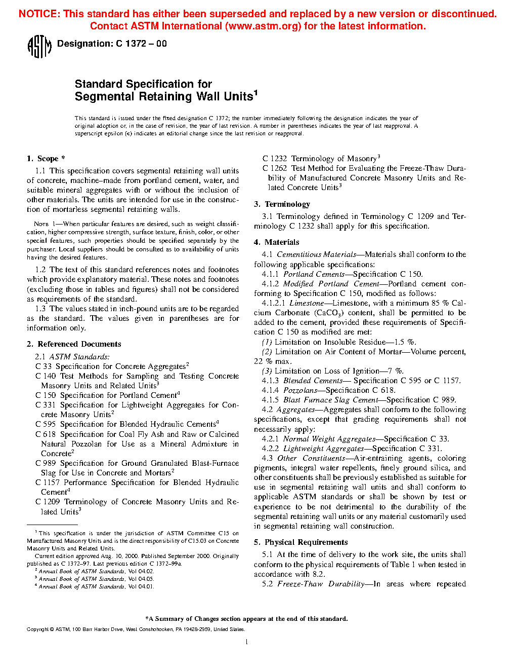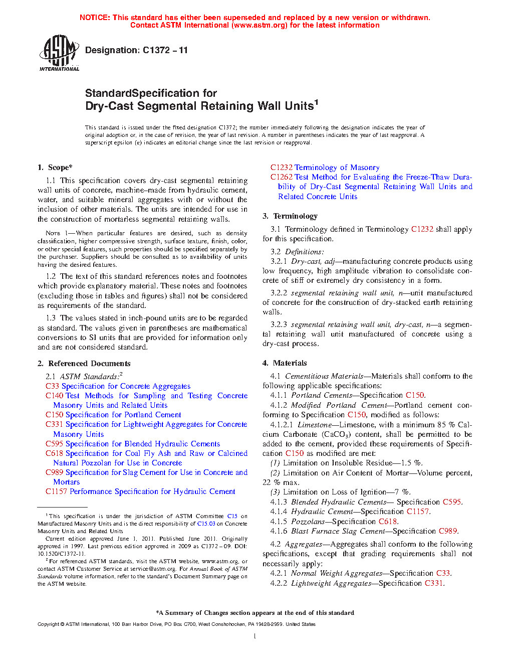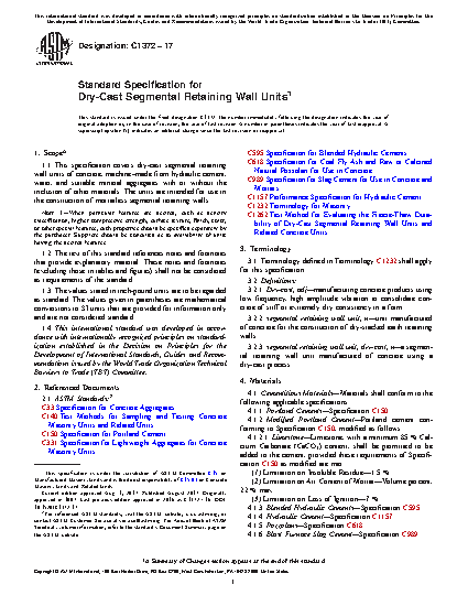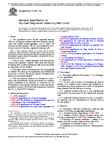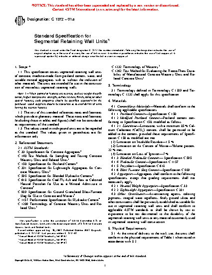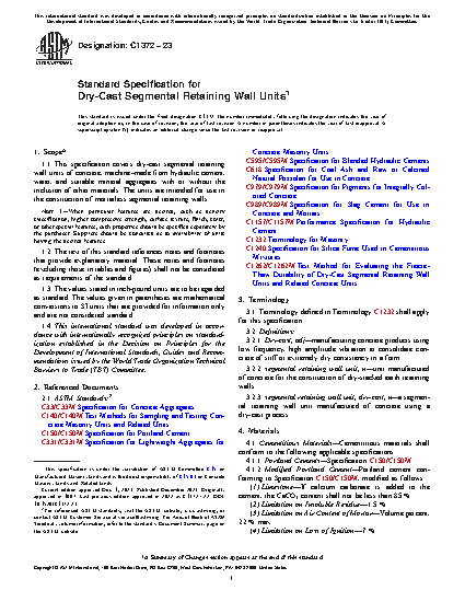 1.1 This specification covers segmental retaining wall units of concrete, machine-made from portland cement, water, and suitable mineral aggregates with or without the inclusion of other materials. The units are intended for use in the construction of mortarless segmental retaining walls.
