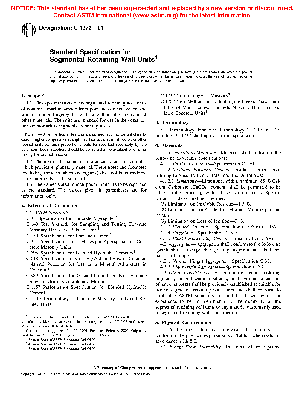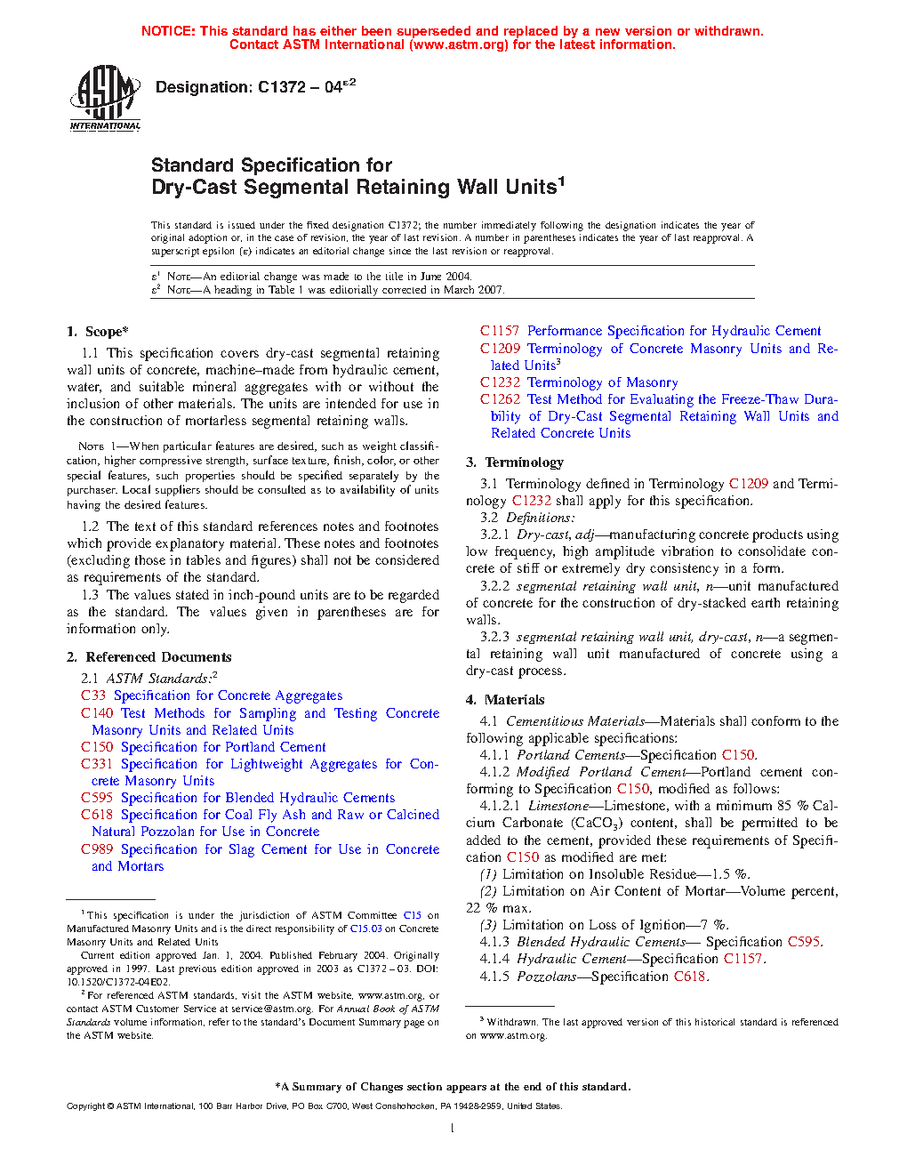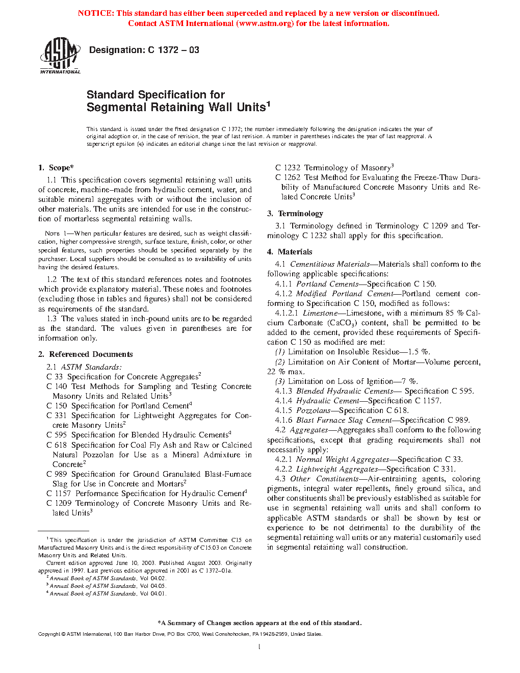 1.1 This specification covers segmental retaining wall units of concrete, machine-made from portland cement, water, and suitable mineral aggregates with or without the inclusion of other materials. The units are intended for use in the construction of mortarless segmental retaining walls.