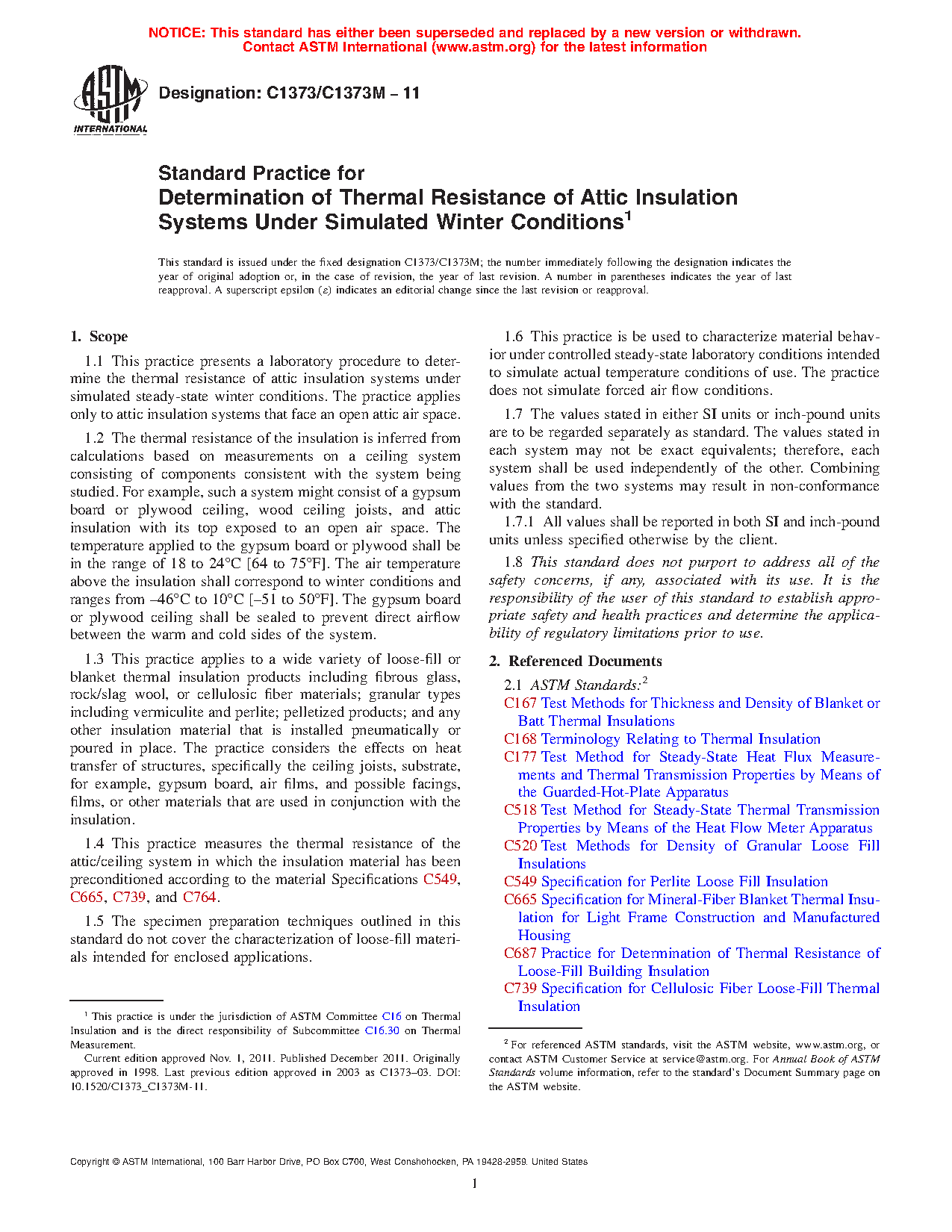 1.1 This practice presents a laboratory procedure to determine the thermal resistance of attic insulation systems under simulated steady-state winter conditions. The practice applies only to attic insulation systems that face an open attic air space.