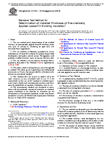 1.2 This test method is a laboratory procedure for use by manufacturers of loose-fill insulation for product design, label development, and quality control testing. The apparatus used produces installed thickness results at a given mass/unit area.
