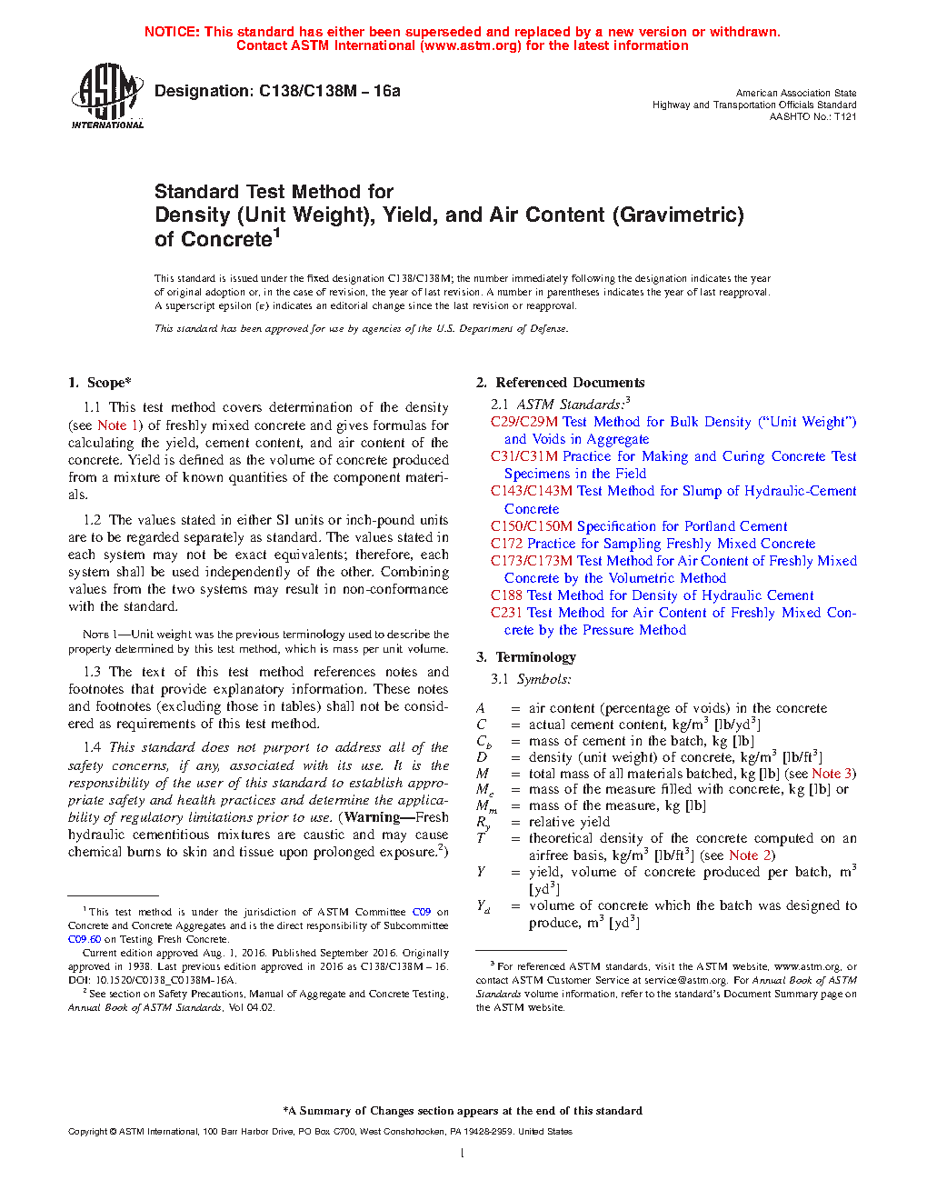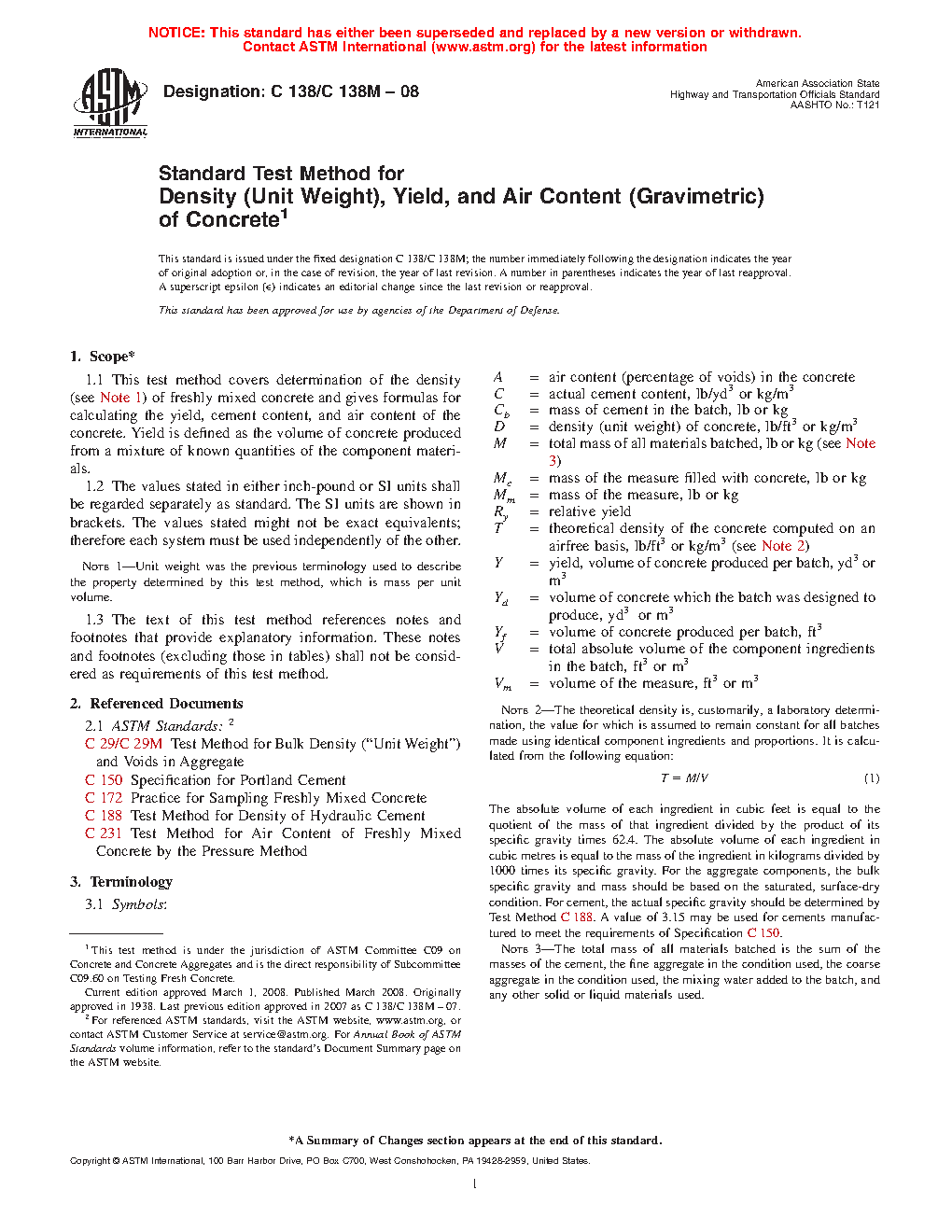 1.1 This test method covers determination of the density (see Note 1) of freshly mixed concrete and gives formulas for calculating the yield, cement content, and air content of the concrete. Yield is defined as the volume of concrete produced from a mixture of known quantities of the component materials.