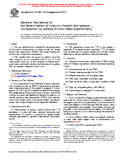 1.1 This test method covers a method for the determination of the uranium concentration in uranium oxides by isotope dilution mass spectrometry (IDMS). The isotopic composition of the oxide is measured simultaneously.