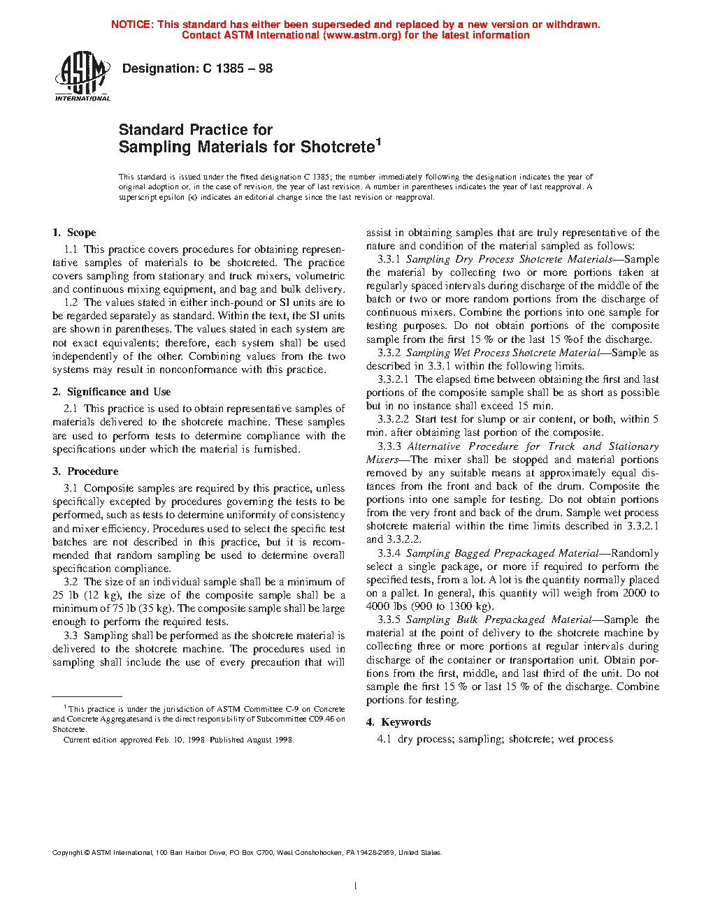1.1 This practice covers procedures for obtaining representative samples of materials to be shotcreted. The practice covers sampling from stationary and truck mixers, volumetric and continuous mixing equipment, and bag and bulk delivery.