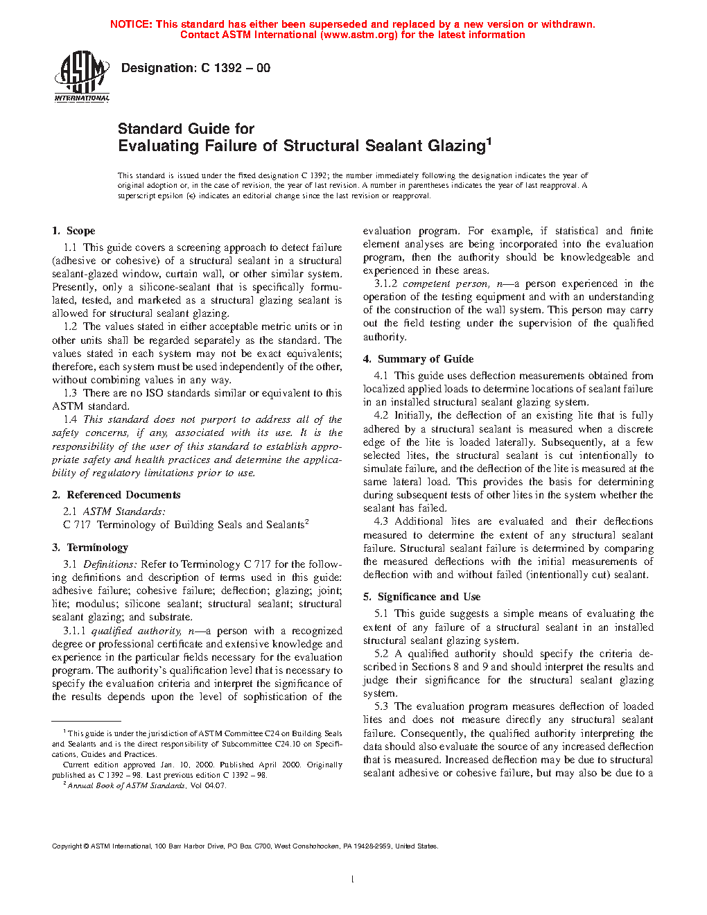 1.1 This guide covers a screening approach to detect failure (adhesive or cohesive) of a structural sealant in a structural sealant-glazed window, curtain wall, or other similar system. Presently, only a silicone-sealant that is specifically formulated, tested, and marketed as a structural glazing sealant is allowed for structural sealant glazing.