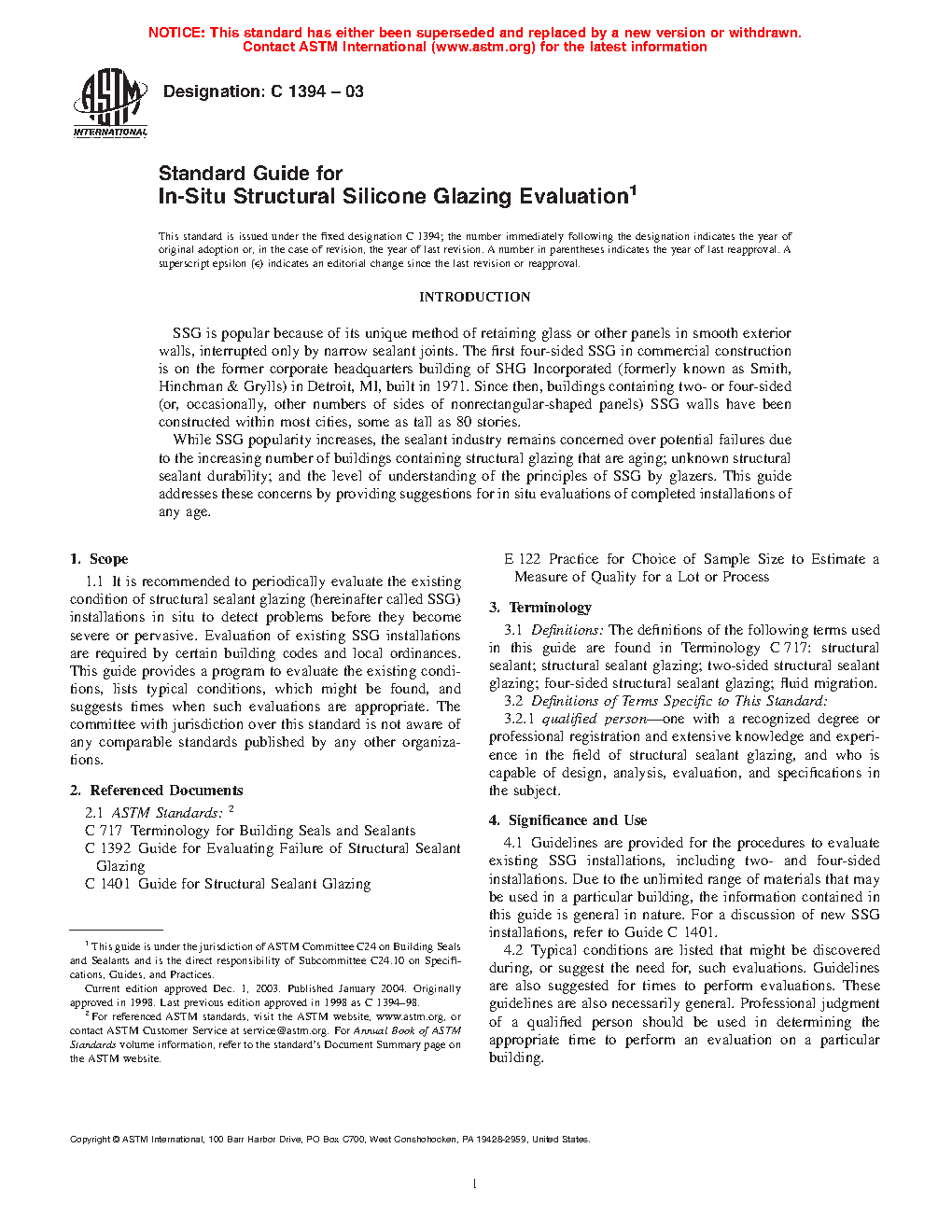 1.1 It is recommended to periodically evaluate the existing condition of structural sealant glazing (hereinafter called SSG) installations in situ to detect problems before they become severe or pervasive. Evaluation of existing SSG installations are required by certain building codes and local ordinances. This guide provides a program to evaluate the existing conditions, lists typical conditions, which might be found, and suggests times when such evaluations are appropriate. The committee with jurisdiction over this standard is not aware of any comparable standards published by any other organizations.