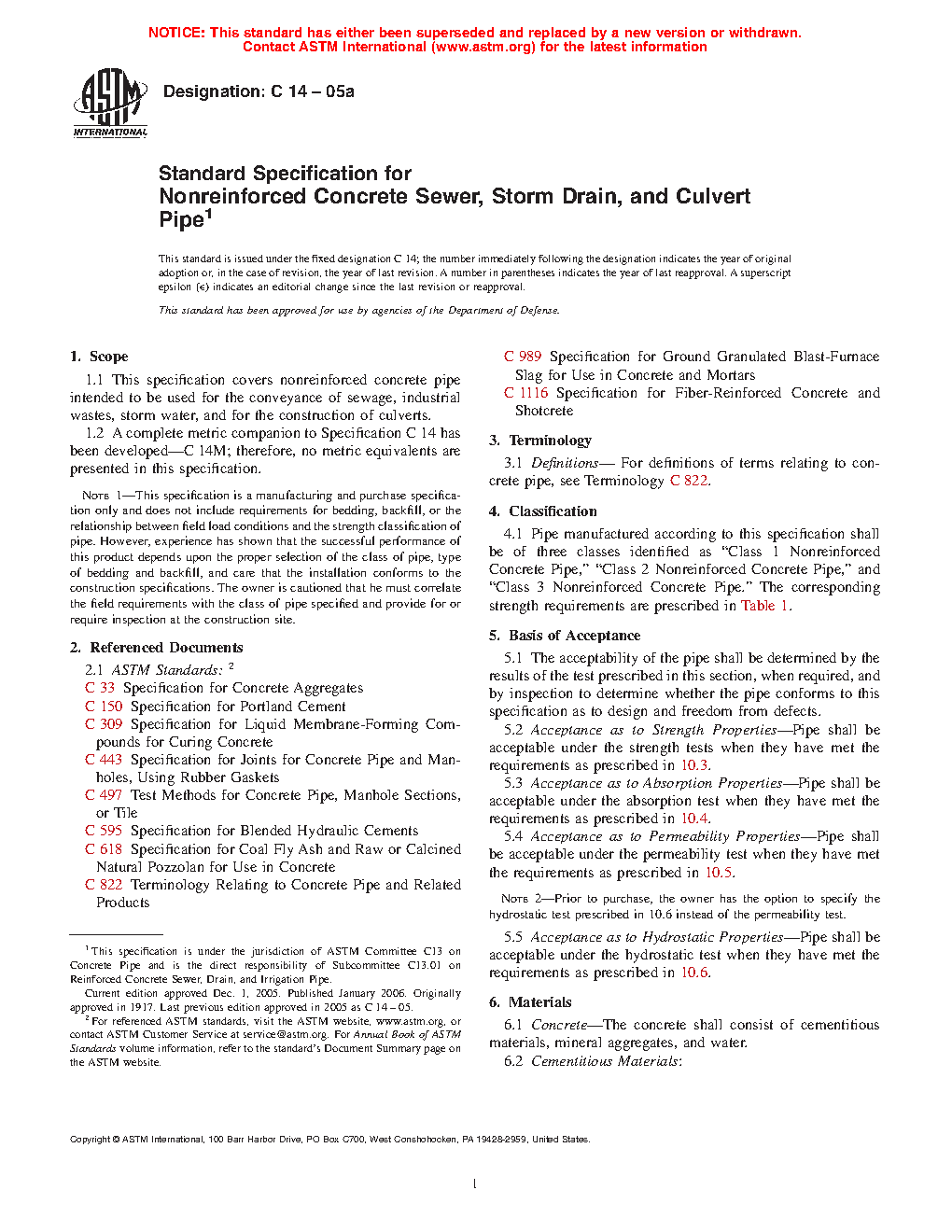 This specification covers nonreinforced concrete sewer, storm drain, and culvert pipe. The pipe manufactured according to this specification shall be of three classes: Class 1, Class 2, and Class 3. The strength requirements for nonreinforced concrete pipe are specified. The concrete shall consist of cementitious material, mineral aggregates, and water. Cementitious materials are the following: cement, fly ash, ground granulated blast furnace slag, and allowable combinations of cementitious materials. The design of the pipe may be according to design tables or modified or special design. The following are the processes for pipe manufacturing: mixture; curing such as pipe curing, water curing, and membrane curing; and specials like shapes or fittings and fabricated branches. The following tests shall be made: strength test, absorption test, permeability test, and hydrostatic test.