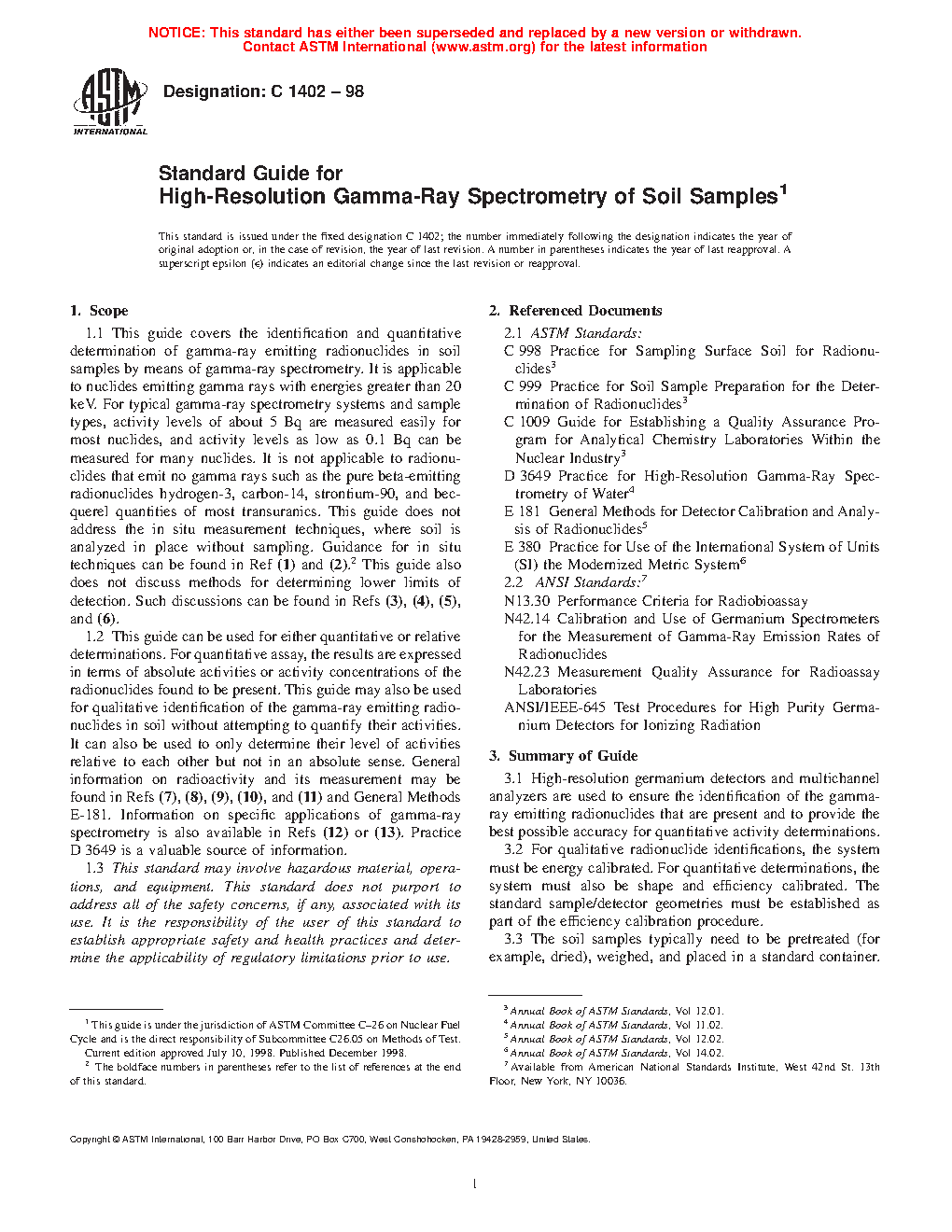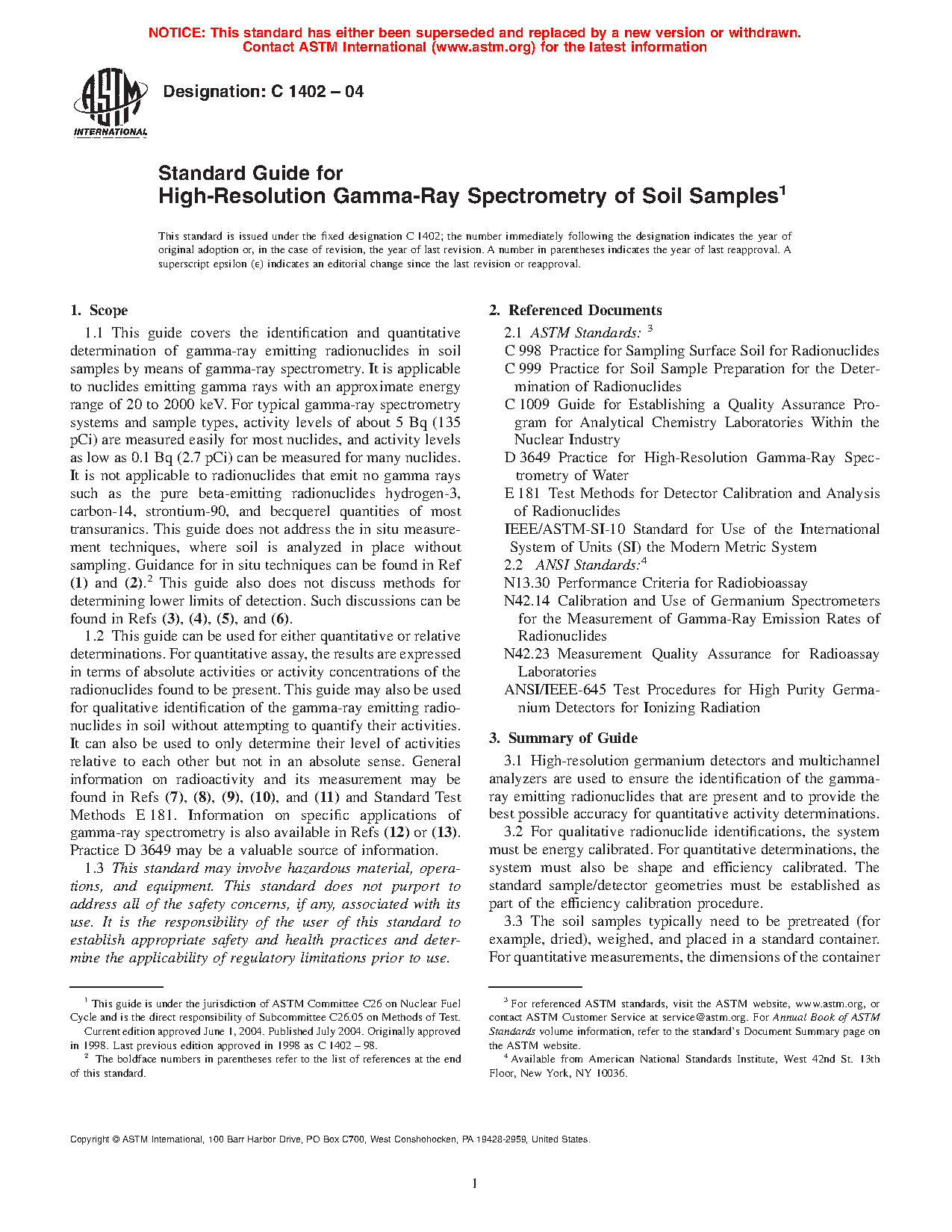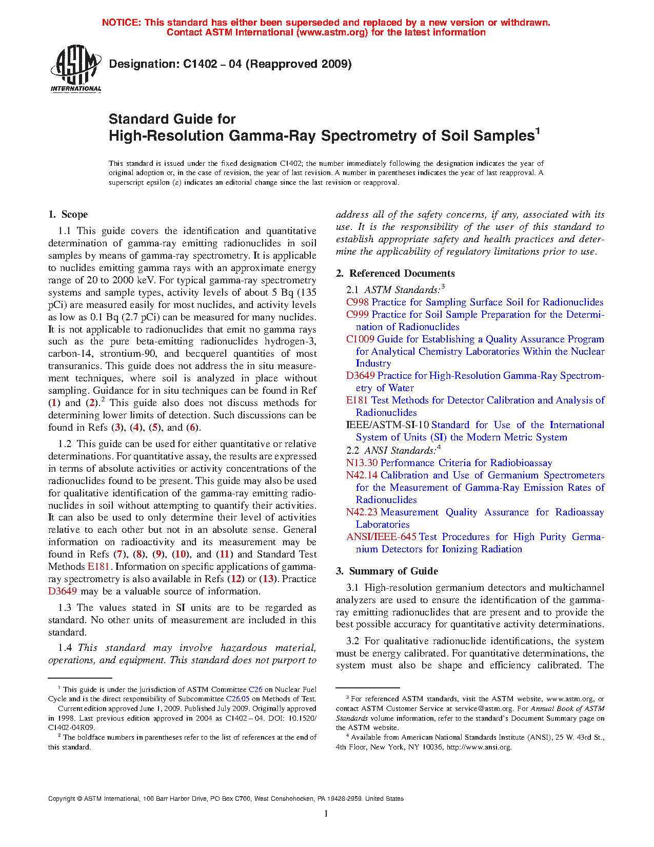 1.1 This guide covers the identification and quantitative determination of gamma-ray emitting radionuclides in soil samples by means of gamma-ray spectrometry. It is applicable to nuclides emitting gamma rays with an approximate energy range of 20 to 2000 keV. For typical gamma-ray spectrometry systems and sample types, activity levels of about 5 Bq (135 pCi) are measured easily for most nuclides, and activity levels as low as 0.1 Bq (2.7 pCi) can be measured for many nuclides. It is not applicable to radionuclides that emit no gamma rays such as the pure beta-emitting radionuclides hydrogen-3, carbon-14, strontium-90, and becquerel quantities of most transuranics. This guide does not address the in situ measurement techniques, where soil is analyzed in place without sampling. Guidance for in situ techniques can be found in Ref (1) and (2).2 This guide also does not discuss methods for determining lower limits of detection. Such discussions can be found in Refs (3), (4), (5) , and (6).