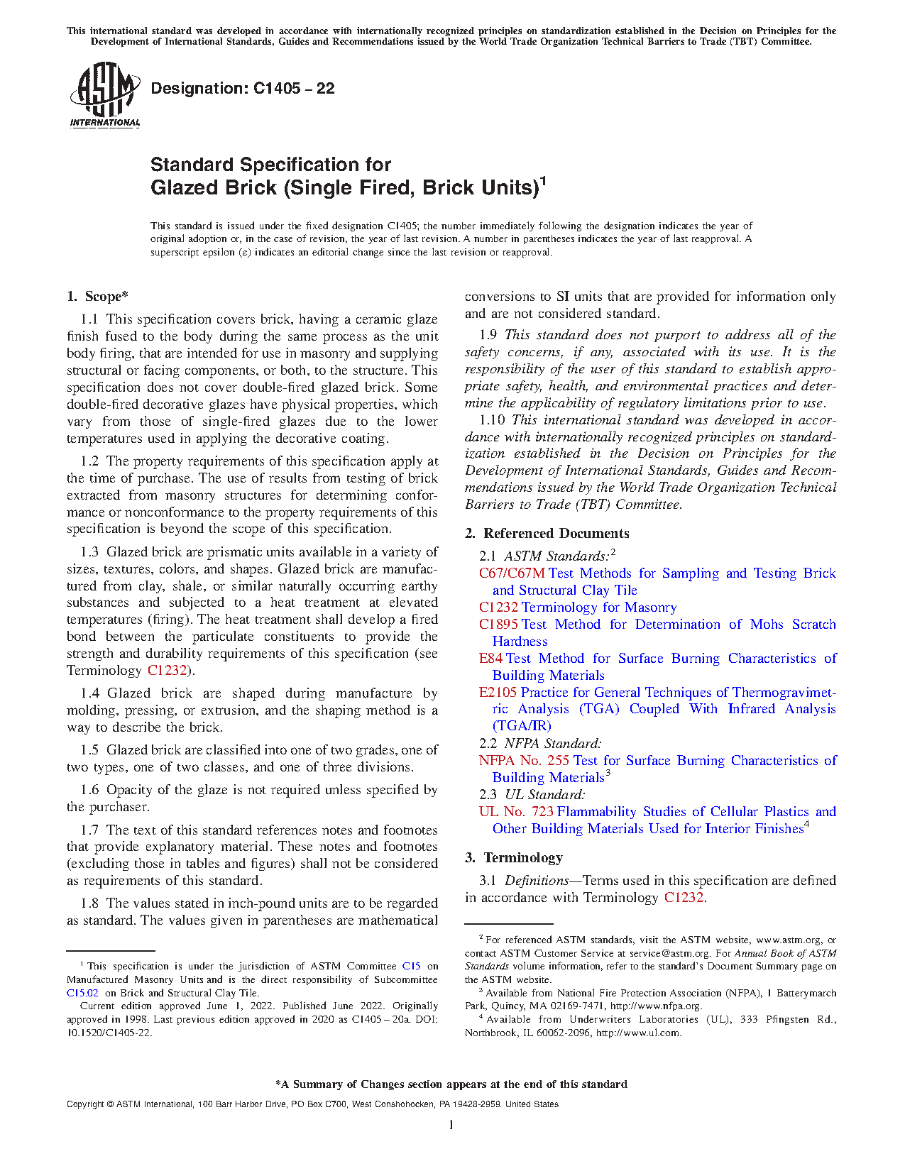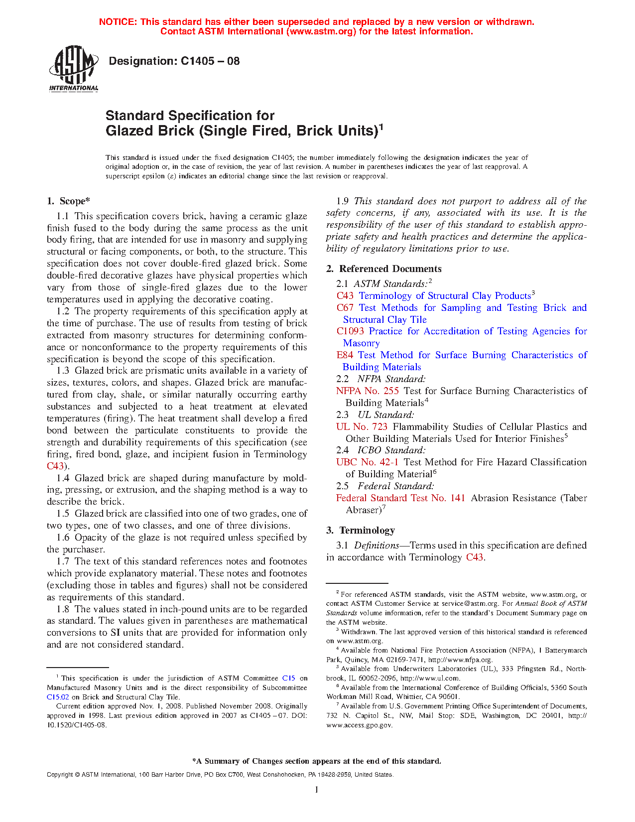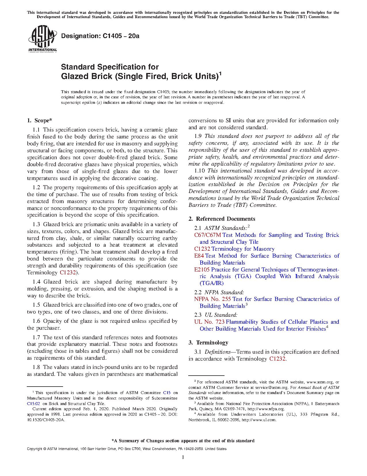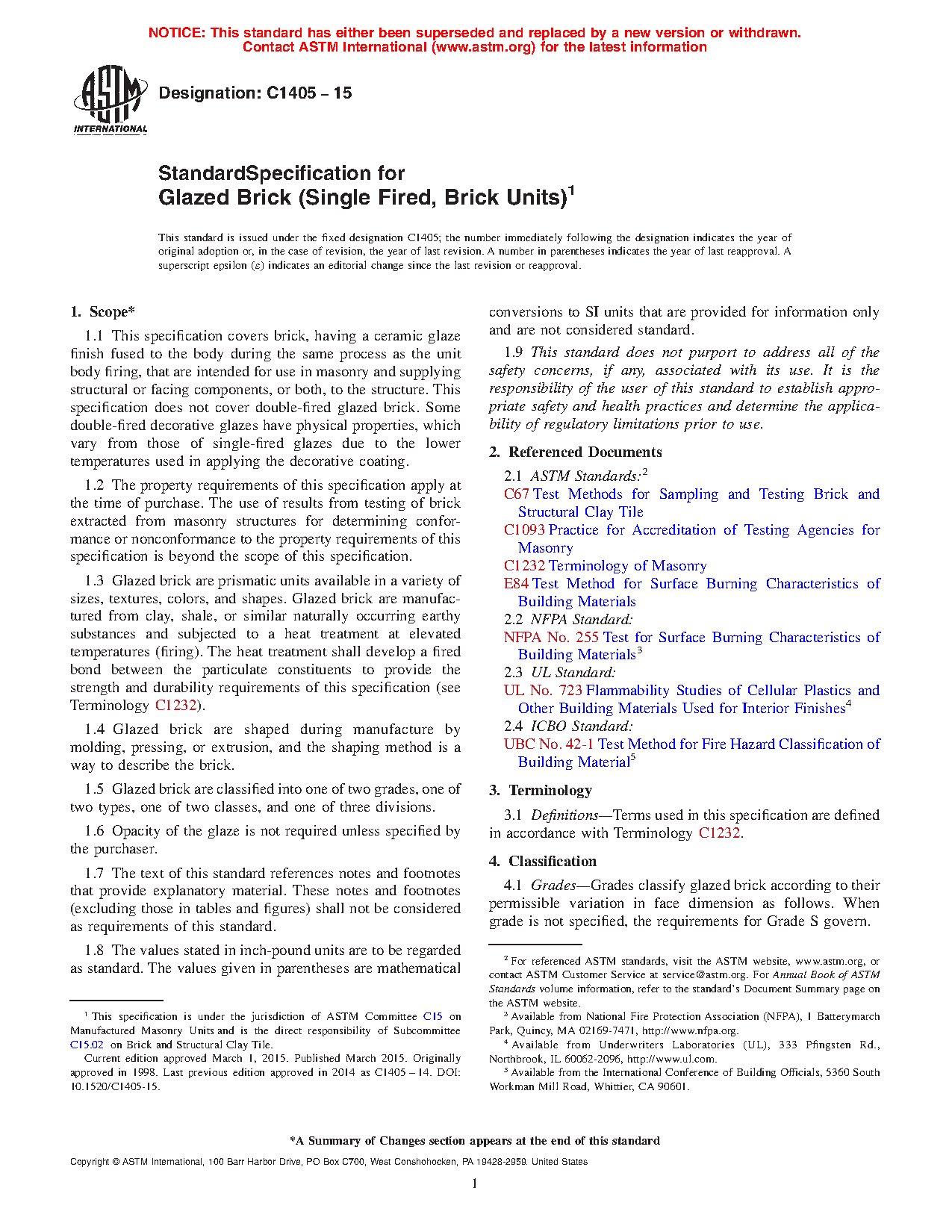 1.1 This specification covers brick, having a ceramic glaze finish fused to the body during the same process as the unit body firing, that are intended for use in masonry and supplying structural or facing components, or both, to the structure. This specification does not cover double-fired glazed brick. Some double-fired decorative glazes have physical properties, which vary from those of single-fired glazes due to the lower temperatures used in applying the decorative coating.