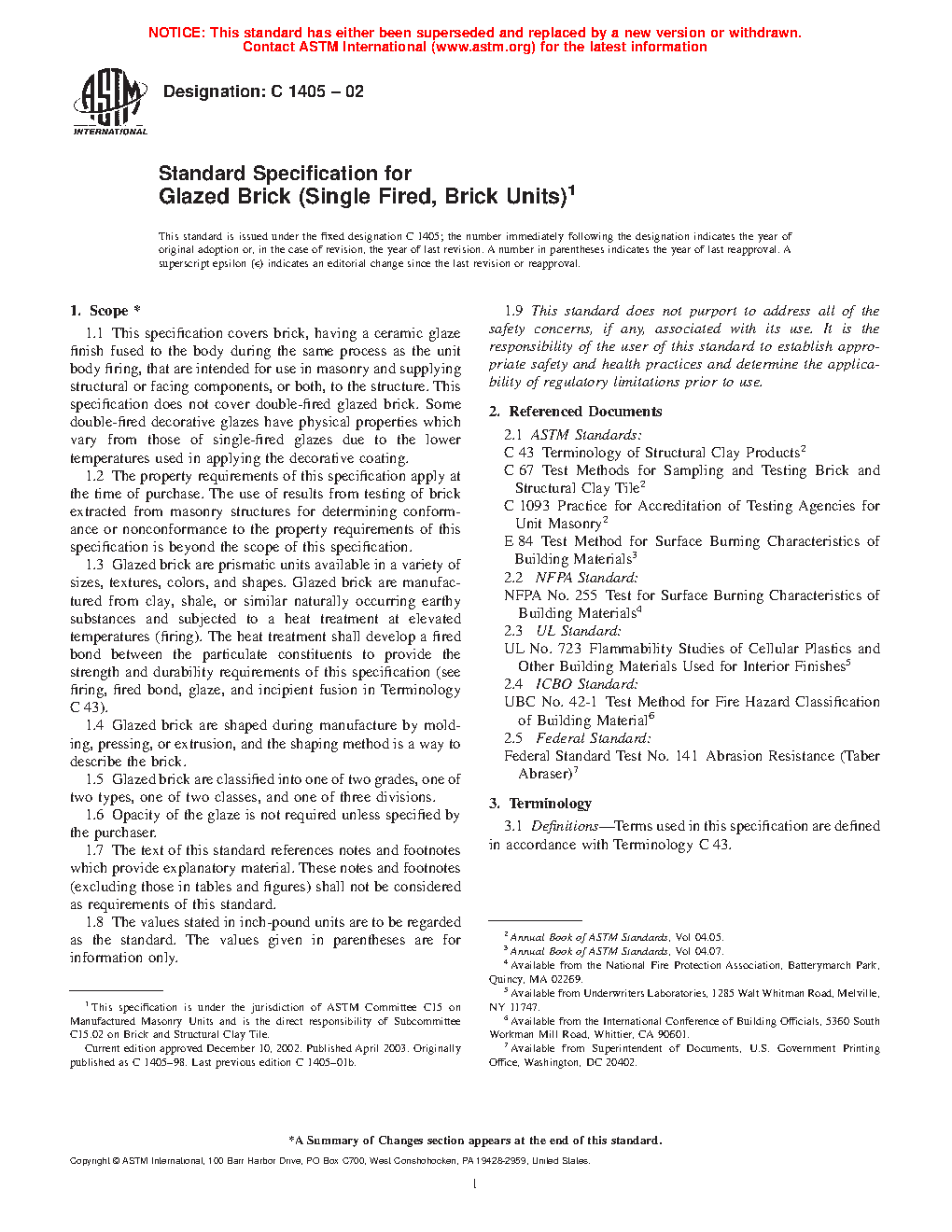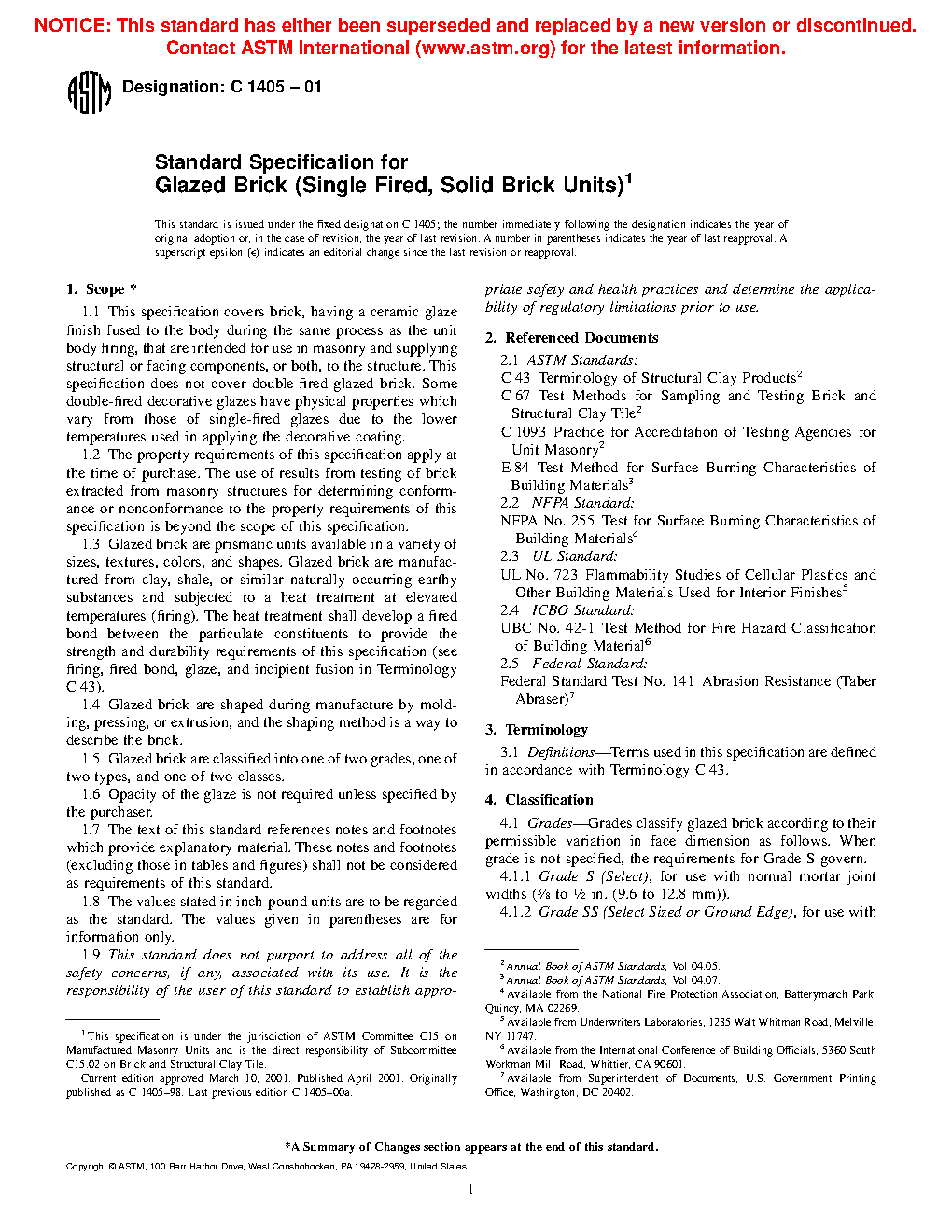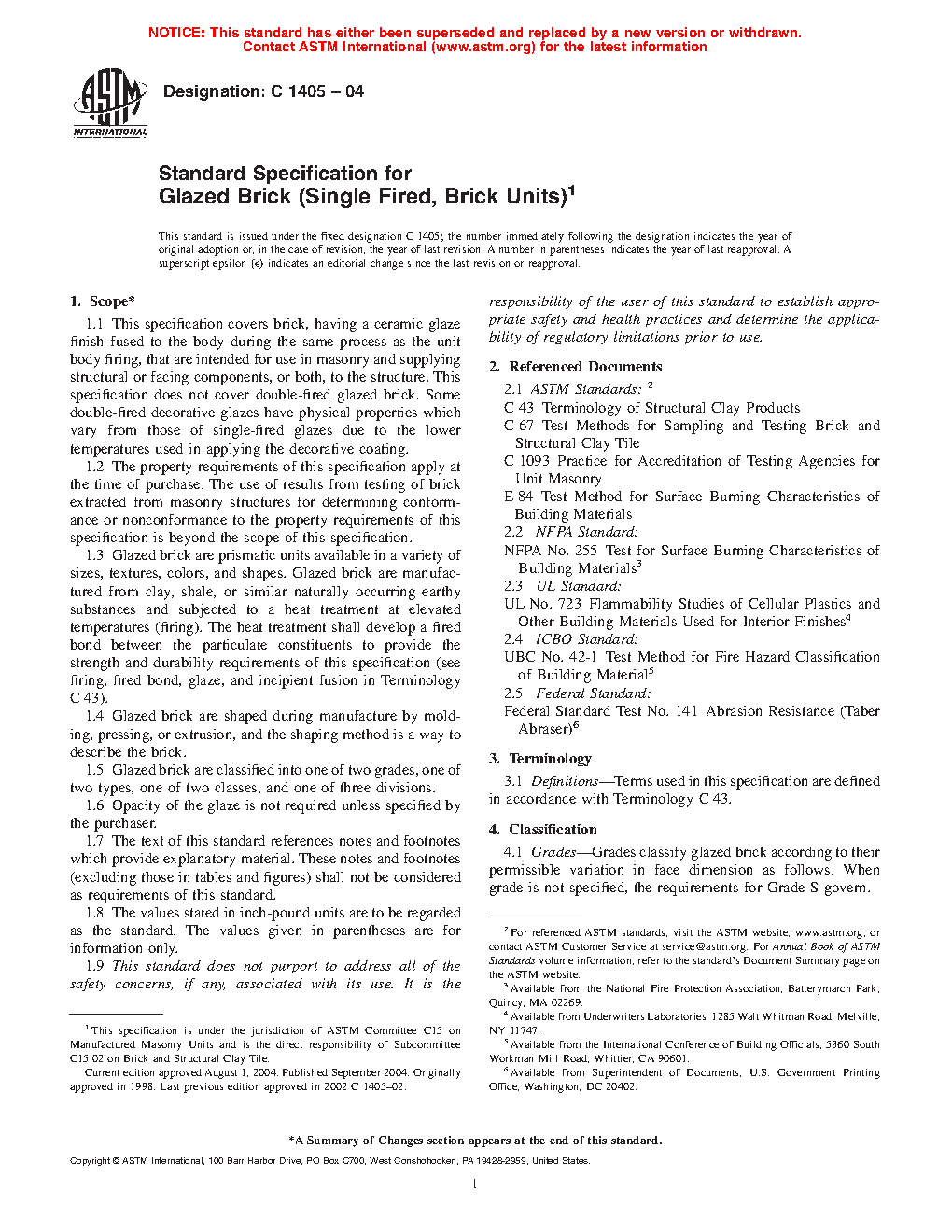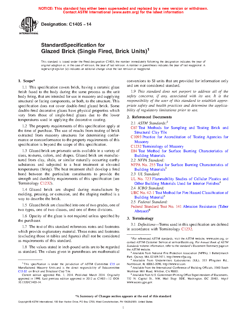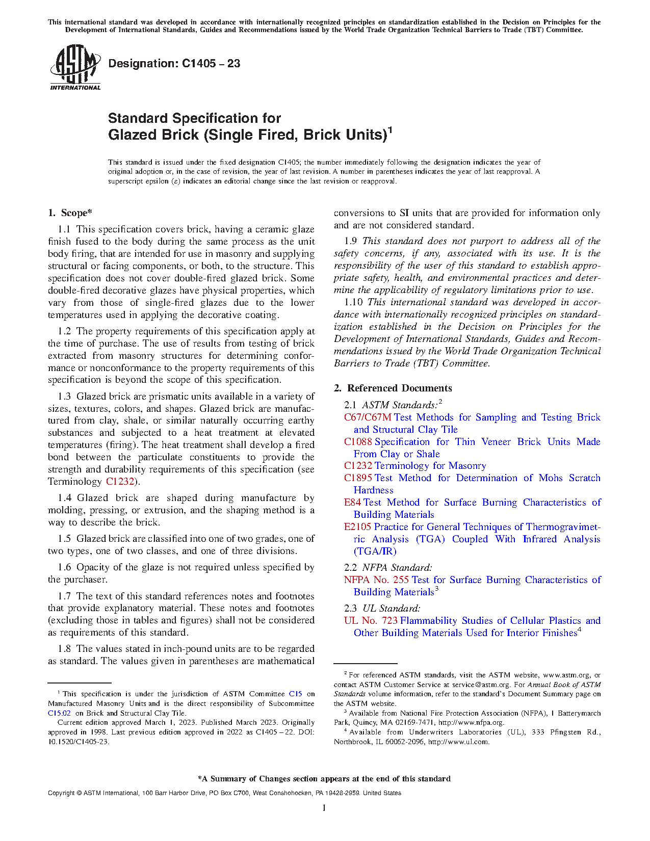 1.1 This specification covers brick, having a ceramic glaze finish fused to the body during the same process as the unit body firing, that are intended for use in masonry and supplying structural or facing components, or both, to the structure. This specification does not cover double-fired glazed brick. Some double-fired decorative glazes have physical properties, which vary from those of single-fired glazes due to the lower temperatures used in applying the decorative coating.