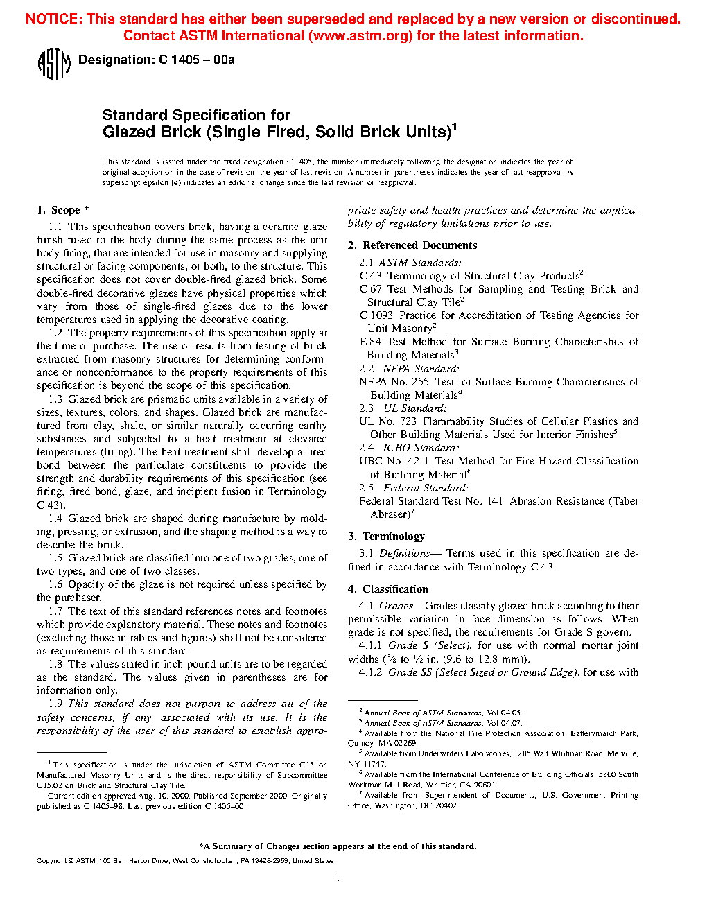 This specification deals with the standards for bricks, having a ceramic glaze finish fused to the body during the same process as the unit body firing, that are intended for use in masonry. These products are also proposed for use in supplying structural or facing components. This specification, however, doest not cover double-fired glazed brick. The bricks shall be available in two grades: grade S (standard) and grade SS (select sized). Two types and classes of bricks are also covered: type I (single-faced units) and type II (two-faced units); and class exterior and class interior. The glazed bricks shall also conform to the physical properties such as durability, strength and absorption requirements and freezing and thawing requirements.