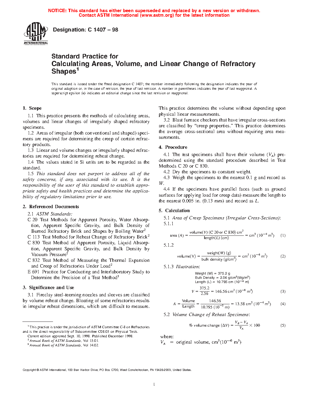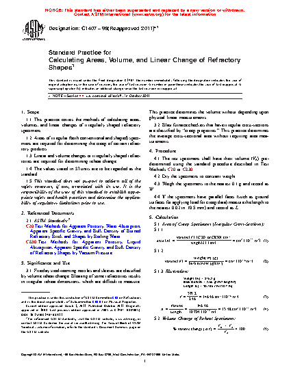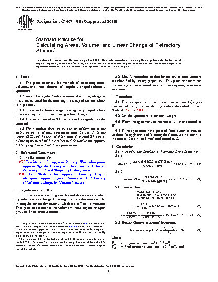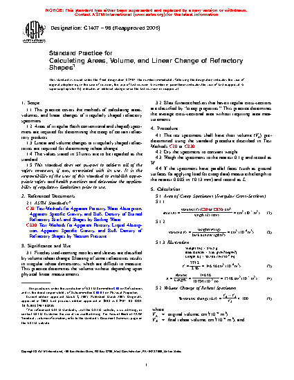1.1 This practice covers the methods of calculating areas, volumes and linear changes of irregularly shaped refractory specimens.