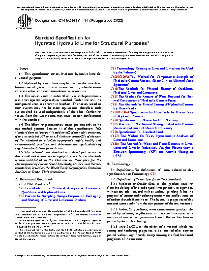 This specification covers hydraulic hydrated lime for structural purposes. Hydraulic hydrated lime may be used in the scratch or brown coat of plaster, stucco, mortar, or in Portland-cement concrete either as blend, amendment, or admixture. The hydraulic hydrated lime shall conform to the chemical composition requirements for calcium oxide, magnesium oxide, silica, iron oxide, aluminum oxide, and carbon dioxide. The sample shall be subjected to the following test methods: chemical analysis; fineness; normal consistency; time of setting; autoclave expansion; and compressive strength.