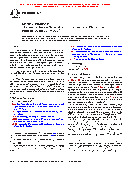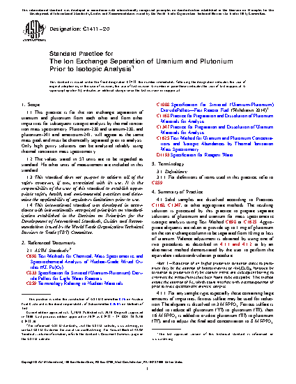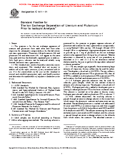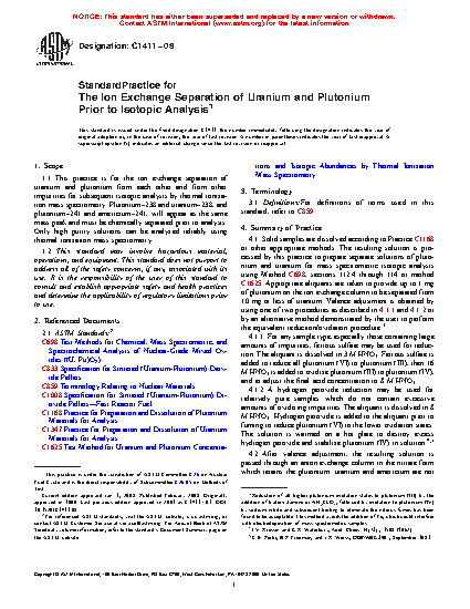 1.1 This practice is for the ion exchange separation of uranium and plutonium from each other and from other impurities for subsequent isotopic analysis by thermal ionization mass spectrometry. Plutonium-238 and uranium-238, and plutonium-241 and americium-241, will appear as the same mass peak and must be chemically separated prior to analysis. Isobaric interferences are separated by chemical means and only high purity solutions can be analyzed reliably using thermal ionization mass spectrometry.