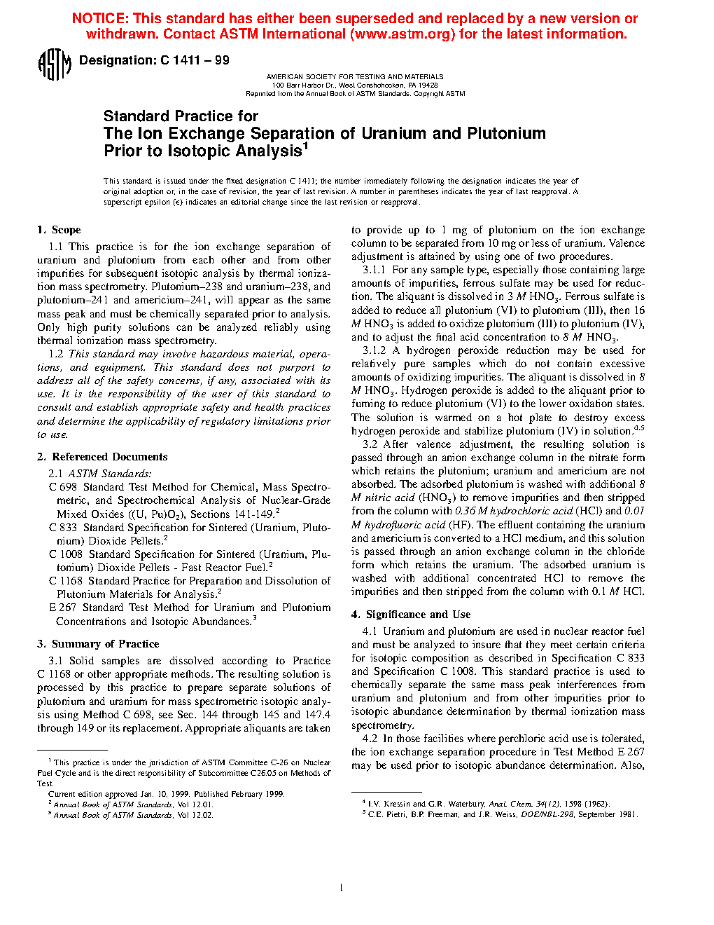 5.1 Uranium and plutonium are used in nuclear reactor fuel and must be analyzed to ensure that they meet certain criteria for isotopic composition as described in Specifications C833 and C1008. This practice is used to chemically separate the same mass peak interferences (isobaric interferences) from uranium and plutonium and from other impurities prior to isotopic abundance determination by thermal ionization mass spectrometry.