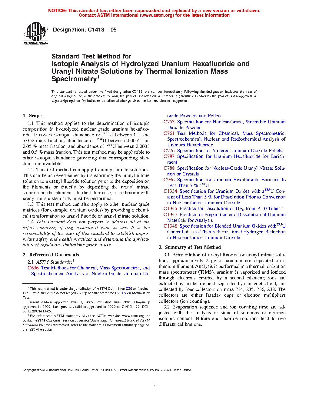 1.2 This test method can apply to uranyl nitrate solutions. This can be achieved either by transforming the uranyl nitrate solution to a uranyl fluoride solution prior to the deposition on the filaments or directly by depositing the uranyl nitrate solution on the filaments. In the latter case, a calibration with uranyl nitrate standards must be performed.