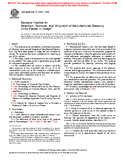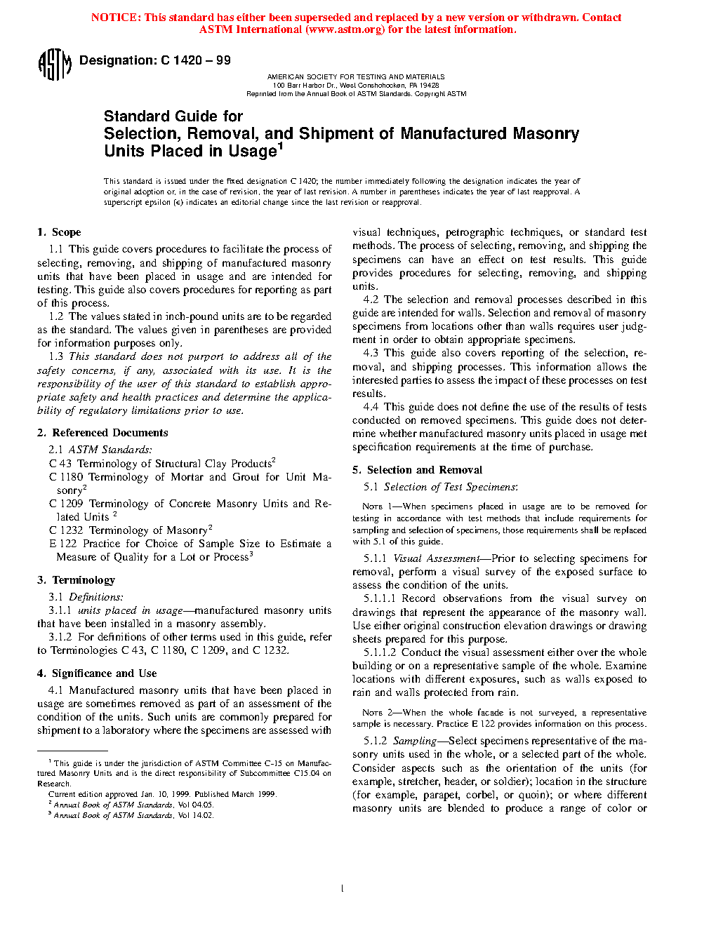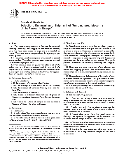 Standard Guide for Selection, Removal, and Shipment of Manufactured Masonry Units Placed in Usage