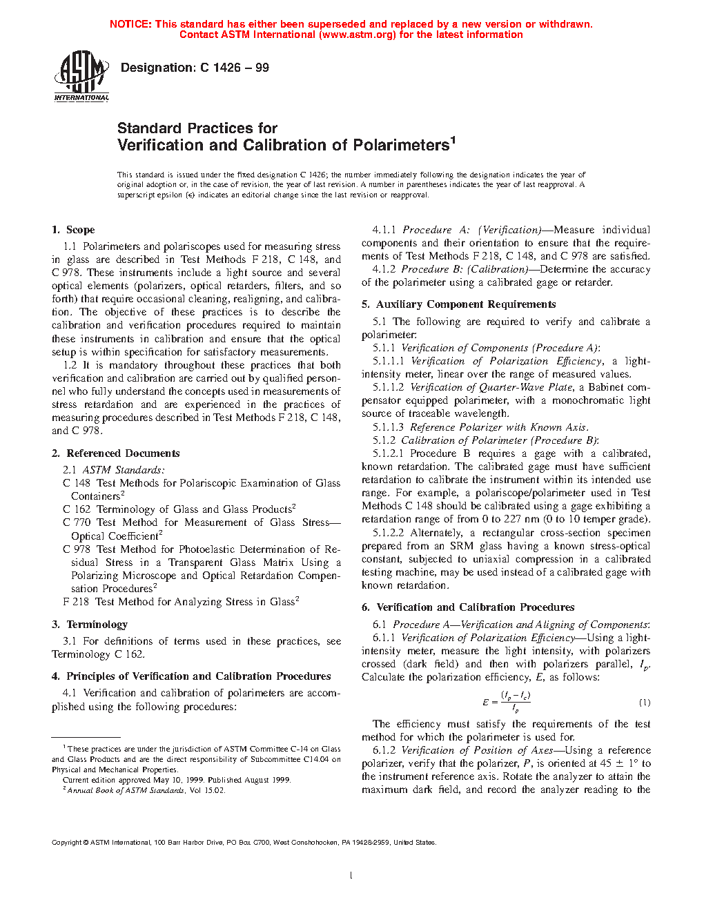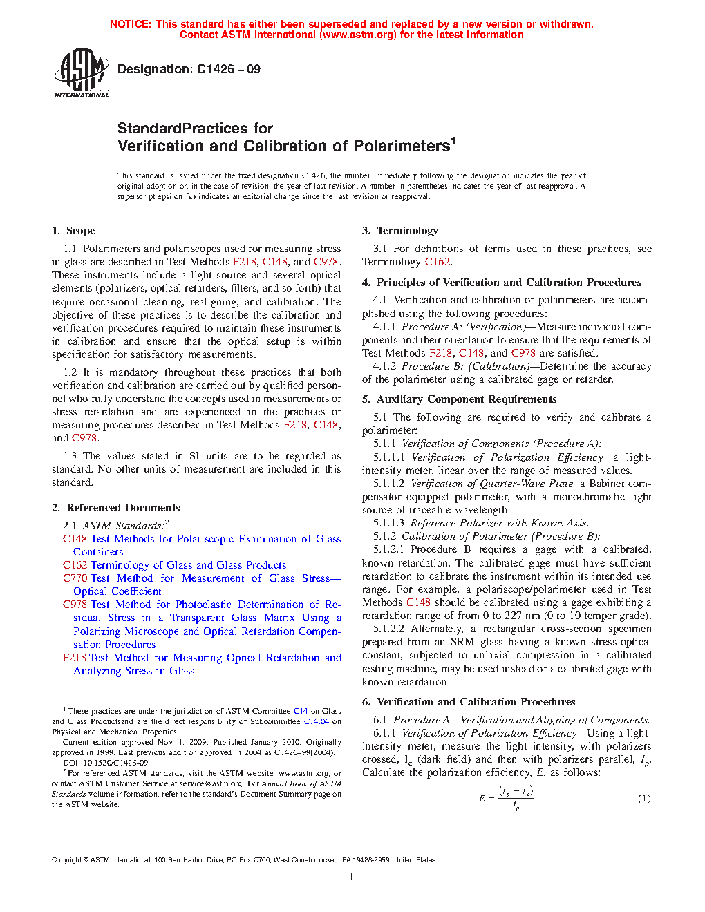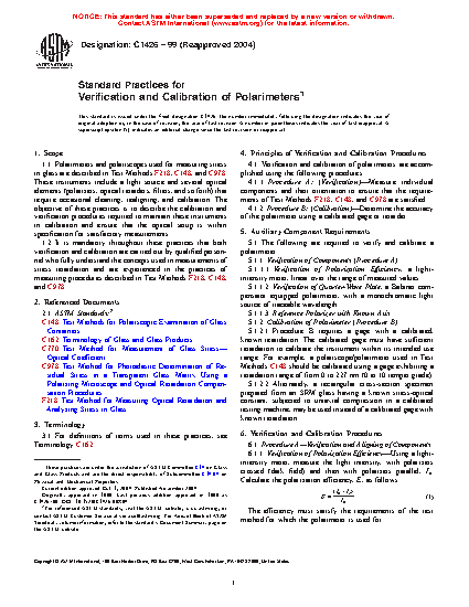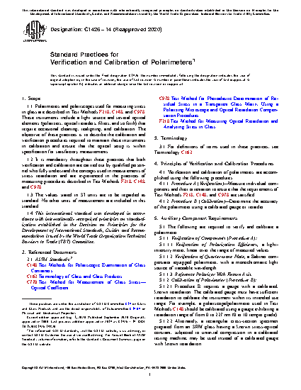 1.1 Polarimeters and polariscopes used for measuring stress in glass are described in Test Methods F218, C148, and C978. These instruments include a light source and several optical elements (polarizers, optical retarders, filters, and so forth) that require occasional cleaning, realigning, and calibration. The objective of these practices is to describe the calibration and verification procedures required to maintain these instruments in calibration and ensure that the optical setup is within specification for satisfactory measurements.