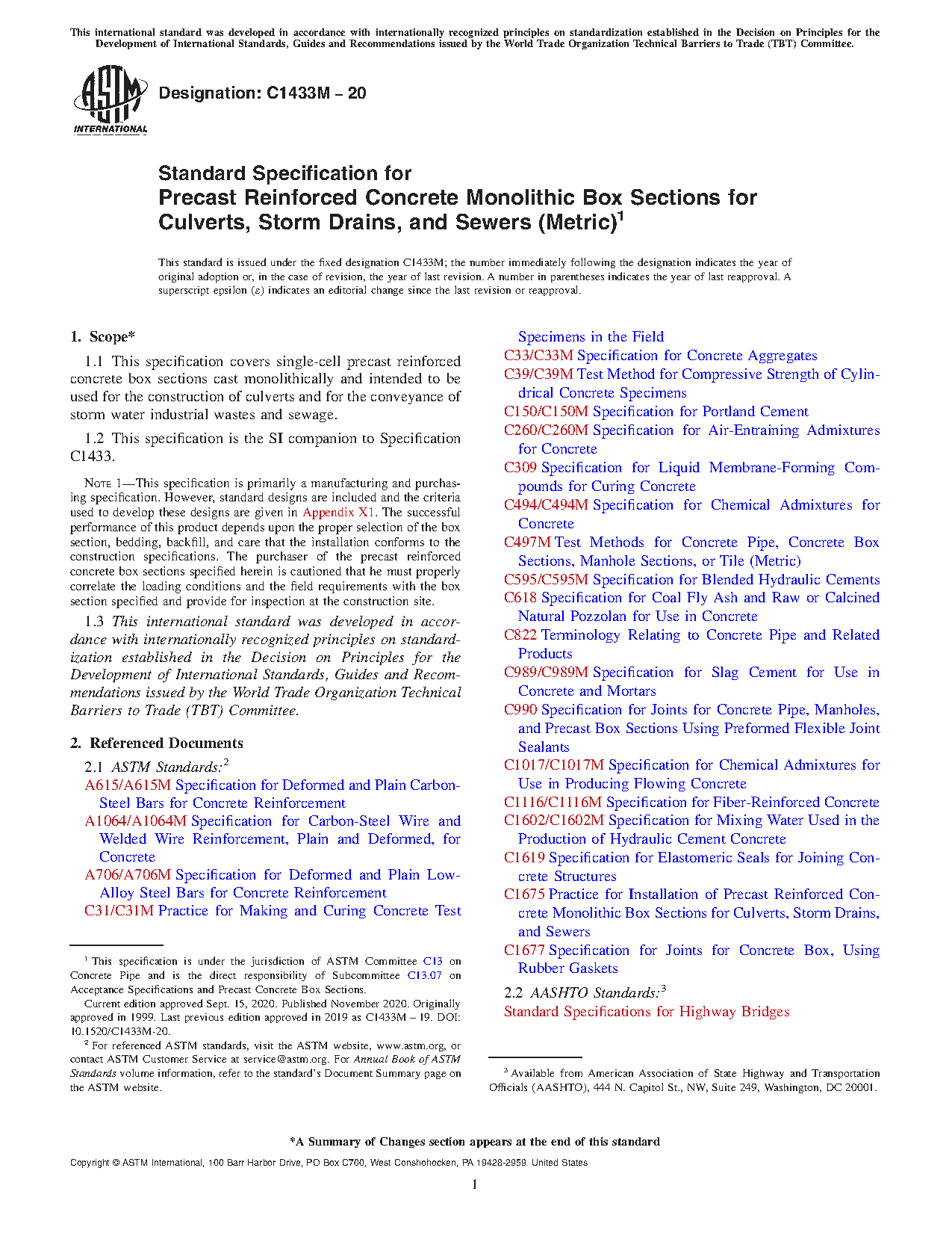 1.1 This specification covers single-cell precast reinforced concrete box sections cast monolithically and intended to be used for the construction of culverts and for the conveyance of storm water industrial wastes and sewage.