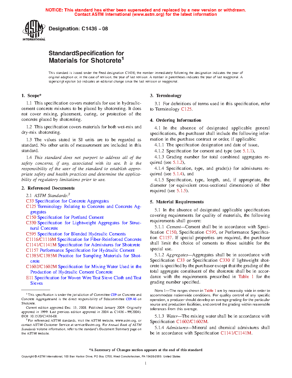 This specification covers the materials for use in hydraulic-cement concrete mixtures to be placed by wet-mix and dry-mix shotcreting. It does not however cover mixing, placement, curing, or protection of the concrete placed by shotcreting. The materials used as ingredients shall consist of cements, aggregates, water, mineral and chemical admixtures, and fibers. Testing, number of tests, and retests shall be performed on the specified materials to ensure the quality of the materials.