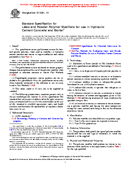 1.2 The performance criteria are based on certain property changes that are achieved by use of the polymer modifier compared with reference concrete or mortar (Test Methods C 1439).