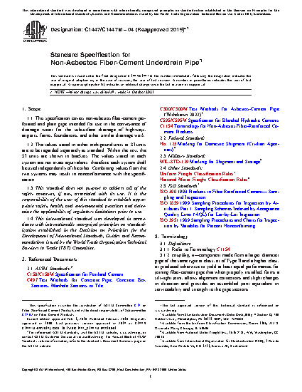 This specification covers the standard for non-asbestos fiber-cement perforated and plain pipe proposed for use in the conveyance of drainage water for the subsurface drainage of highways, airports, farms, foundations, and other similar drainage work. The pipes shall be composed of a mixture of inorganic hydraulic binder or a calcium silicate binder formed by the chemical reaction of siliceous material and a calcareous material reinforced by organic or inorganic fibers. The material shall be cured and formed under pressure and shall be of laminar construction. The material shall also comply with the minimum specified crushing strength.