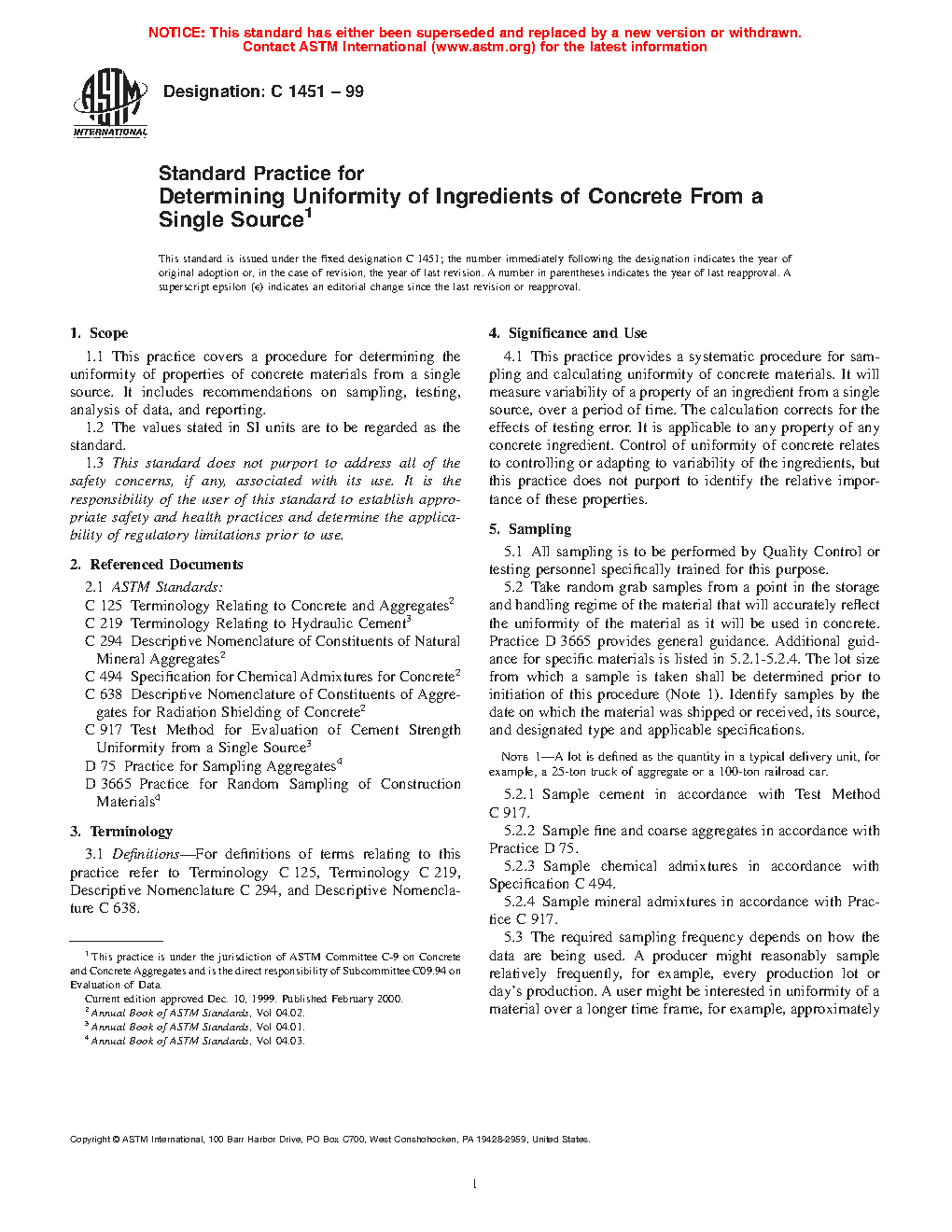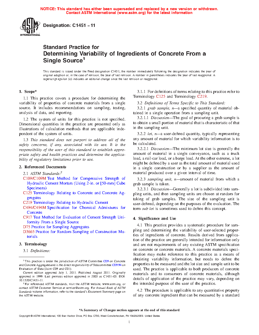 1.1 This practice covers a procedure for determining the variability of concrete-making materials from a single source by measuring a characteristic property of the material. It includes recommendations on sampling, testing, analysis of data, and reporting.