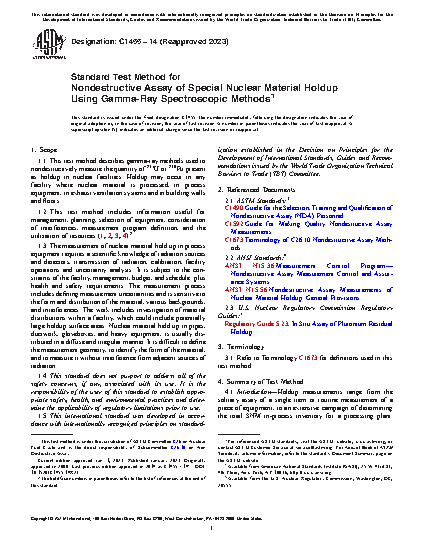 1.3 The measurement of nuclear material hold up in process equipment requires a scientific knowledge of radiation sources and detectors, transmission of radiation, calibration, facility operations and uncertainty analysis. It is subject to the constraints of the facility, management, budget, and schedule; plus health and safety requirements. The measurement process includes defining measurement uncertainties and is sensitive to the form and distribution of the material, various backgrounds, and interferences. The work includes investigation of material distributions within a facility, which could include potentially large holdup surface areas. Nuclear material held up in pipes, ductwork, gloveboxes, and heavy equipment, is usually distributed in a diffuse and irregular manner. It is difficult to define the measurement geometry, to identify the form of the material, and to measure it without interference from adjacent sources of radiation.