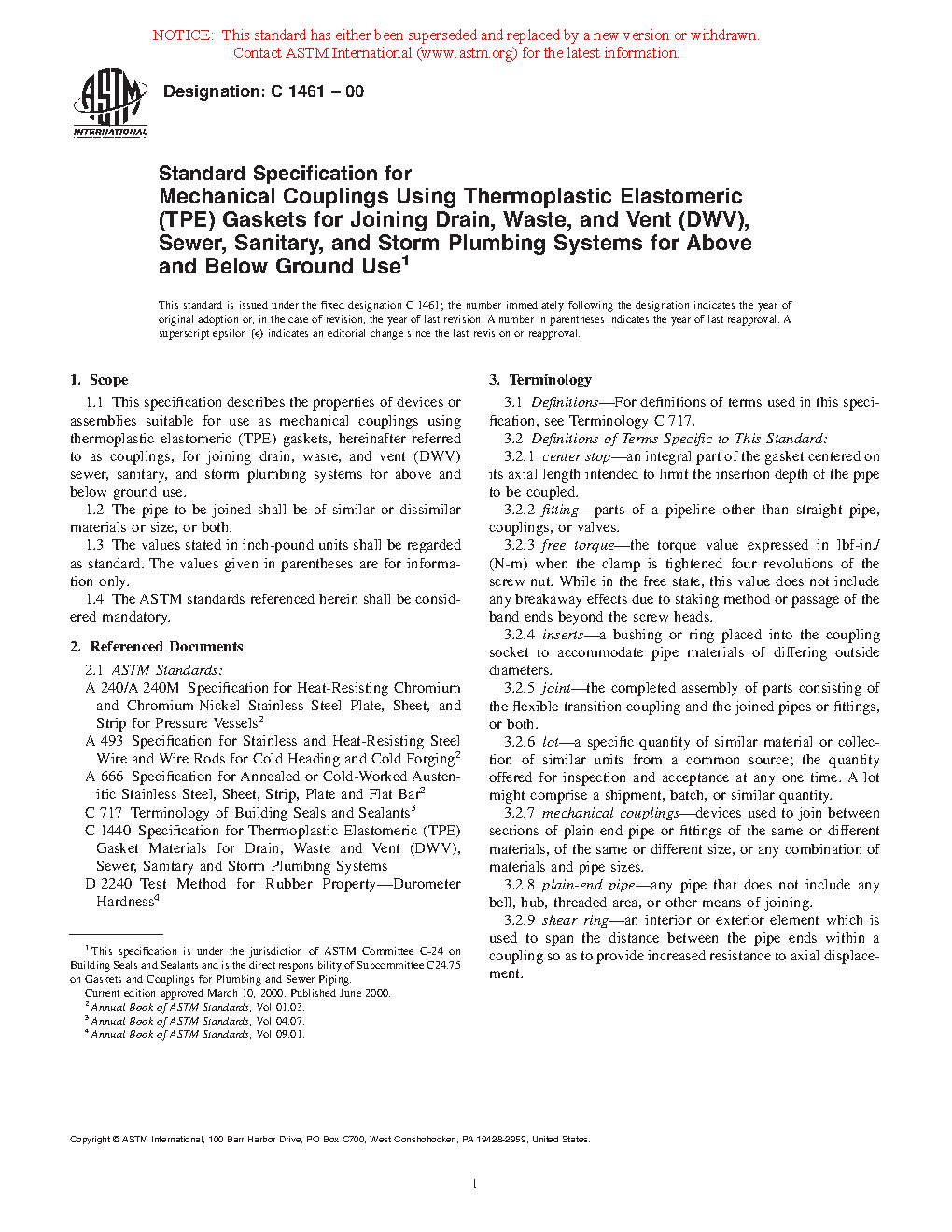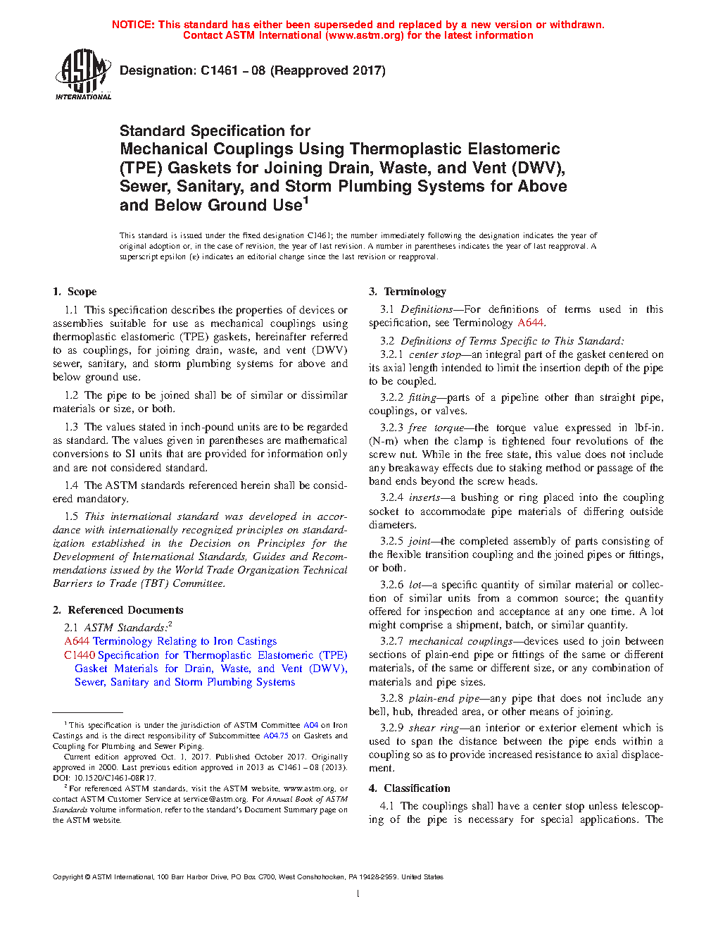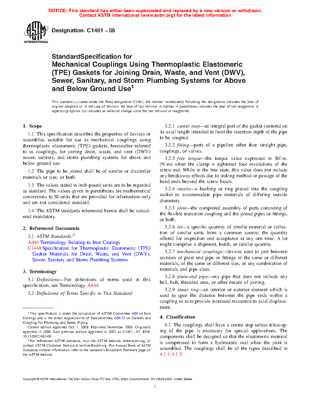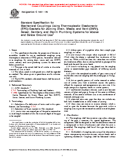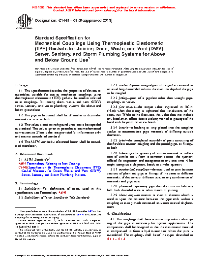 1.1 This specification describes the properties of devices or assemblies suitable for use as mechanical couplings using thermoplastic elastomeric (TPE) gaskets, hereinafter referred to as couplings, for joining drain, waste, and vent (DWV) sewer, sanitary, and storm plumbing systems for above and below ground use.