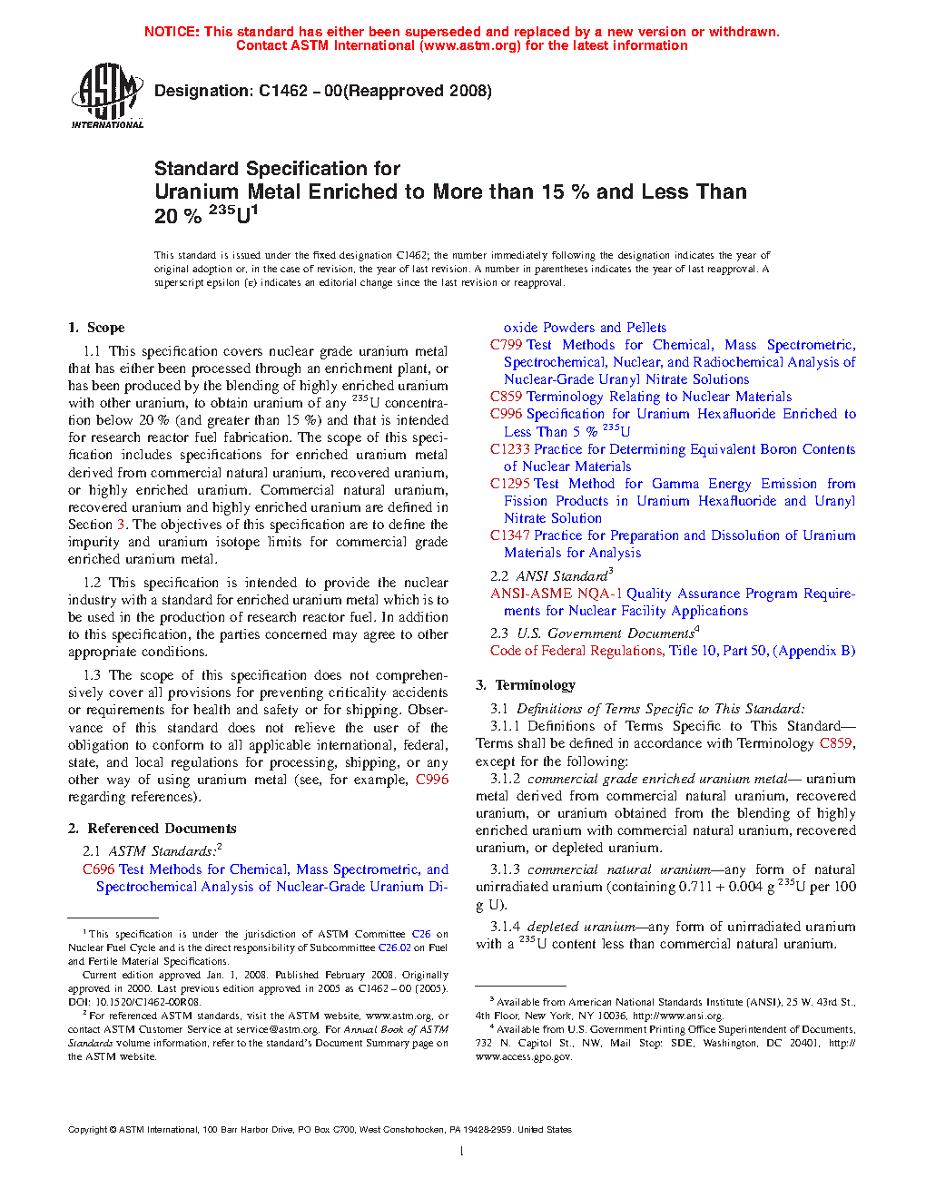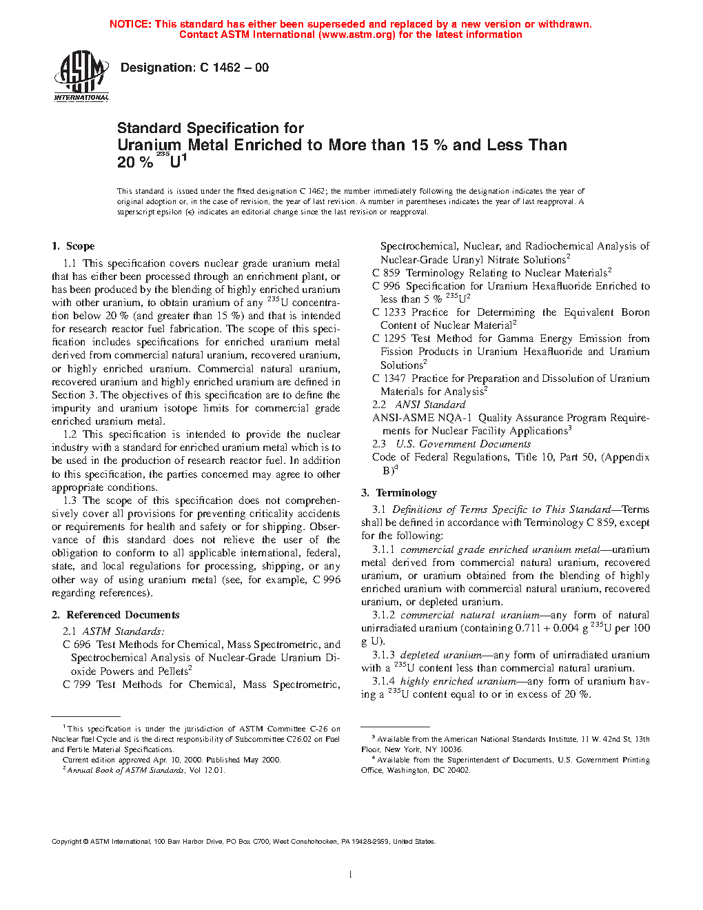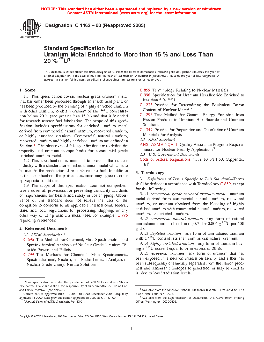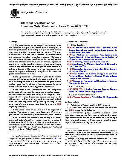 1.2 This specification is intended to provide the nuclear industry with a standard for enriched uranium metal which is to be used in the production of research reactor and generation IV nuclear reactor fuel. In addition to this specification, the parties concerned may agree to other appropriate conditions.