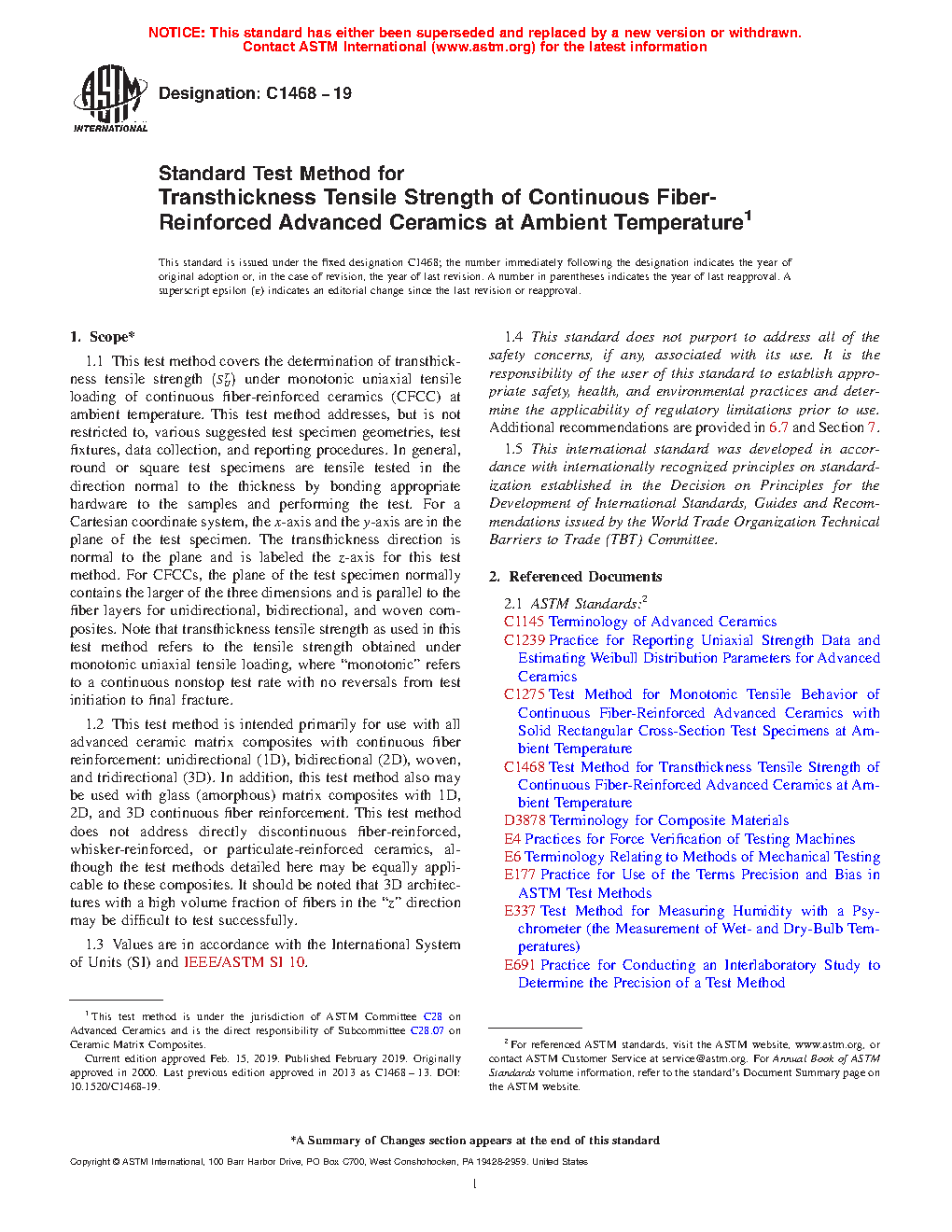 under monotonic uniaxial tensile loading of continuous fiber-reinforced ceramics (CFCC) at ambient temperature. This test method addresses, but is not restricted to, various suggested test specimen geometries, test fixtures, data collection, and reporting procedures. In general, round or square test specimens are tensile tested in the direction normal to the thickness by bonding appropriate hardware to the samples and performing the test. For a Cartesian coordinate system, the x-axis and the y-axis are in the plane of the test specimen. The transthickness direction is normal to the plane and is labeled the z-axis for this test method. For CFCCs, the plane of the test specimen normally contains the larger of the three dimensions and is parallel to the fiber layers for unidirectional, bidirectional, and woven composites. Note that transthickness tensile strength as used in this test method refers to the tensile strength obtained under monotonic uniaxial tensile loading, where “monotonic” refers to a continuous nonstop test rate with no reversals from test initiation to final fracture.