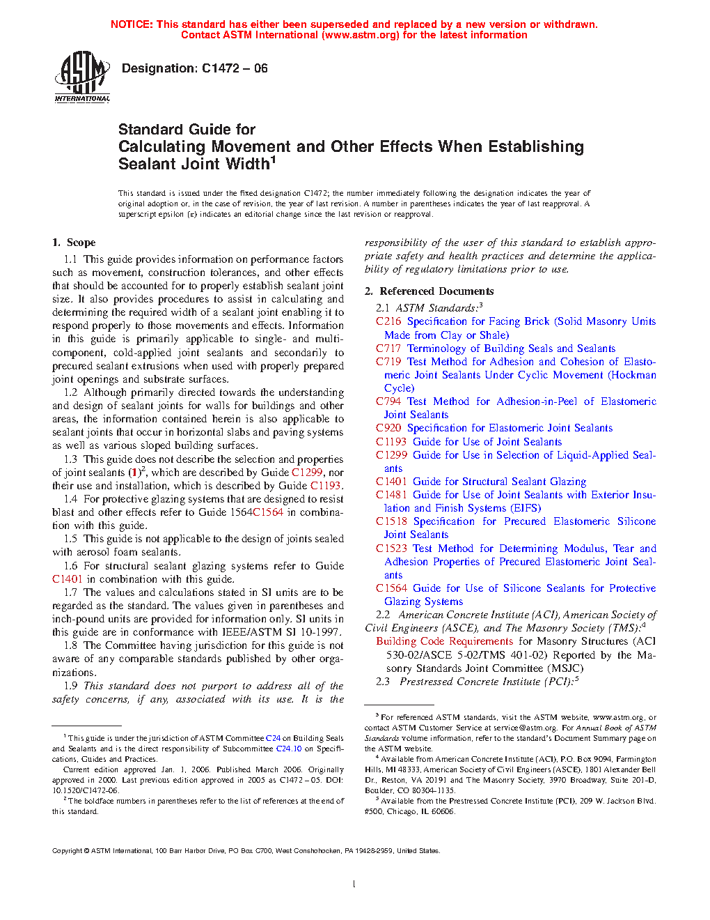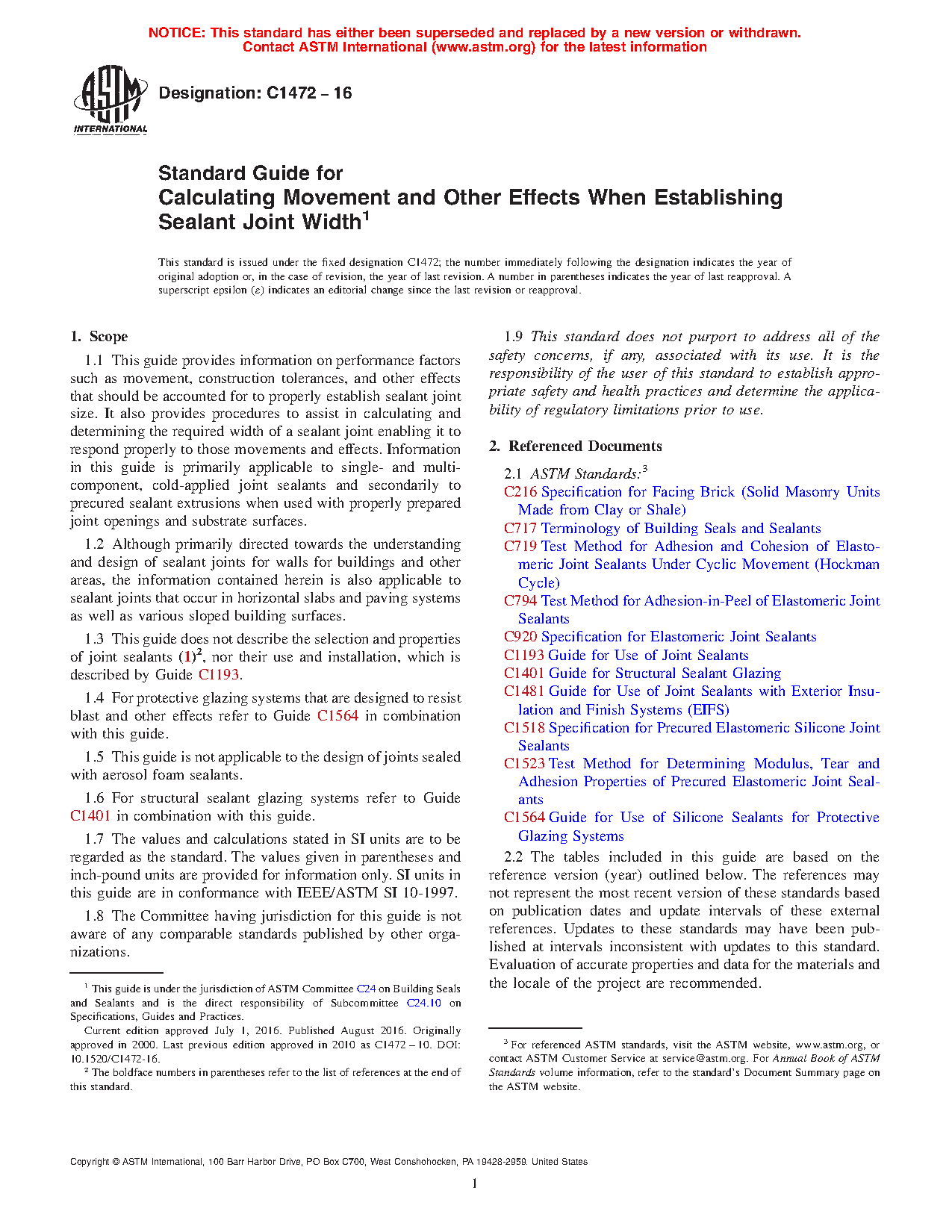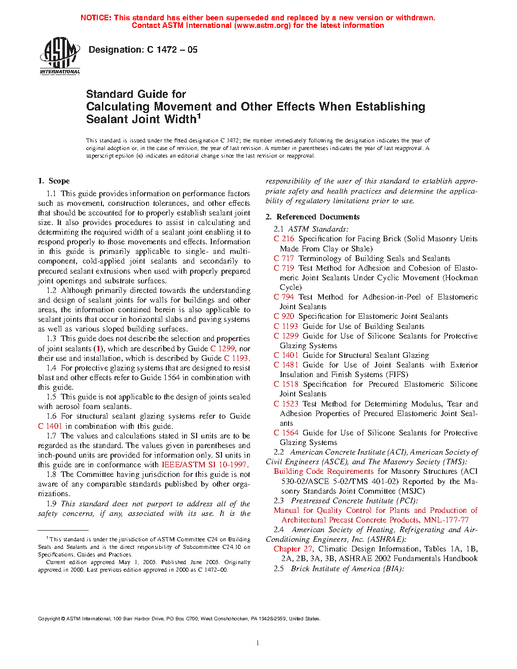 1.3 This guide does not describe the selection and properties of joint sealants (1)2, nor their use and installation, which is described by Guide C1193.