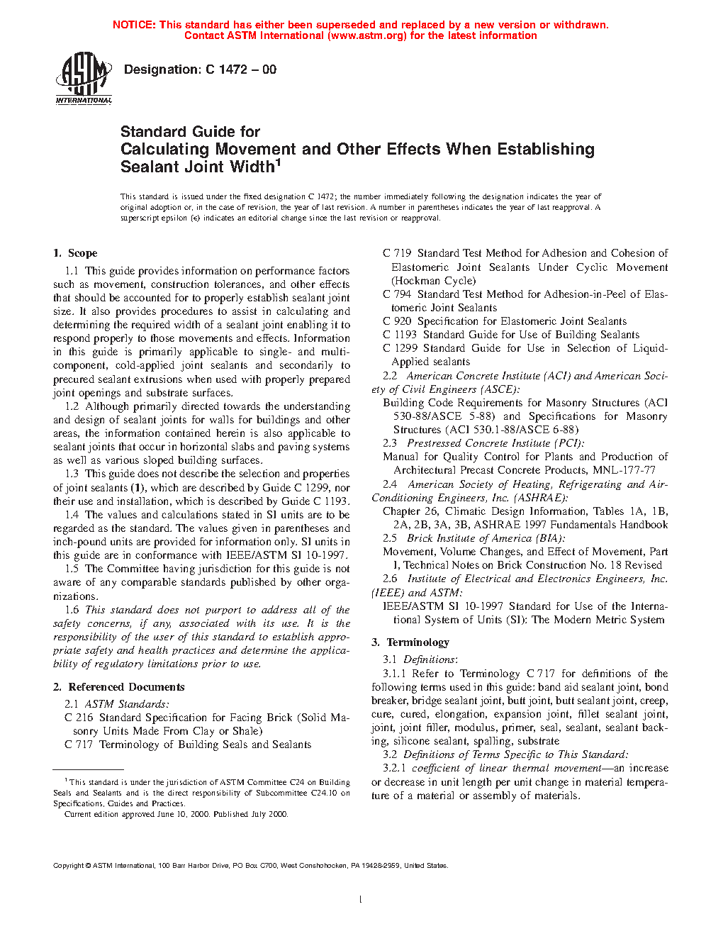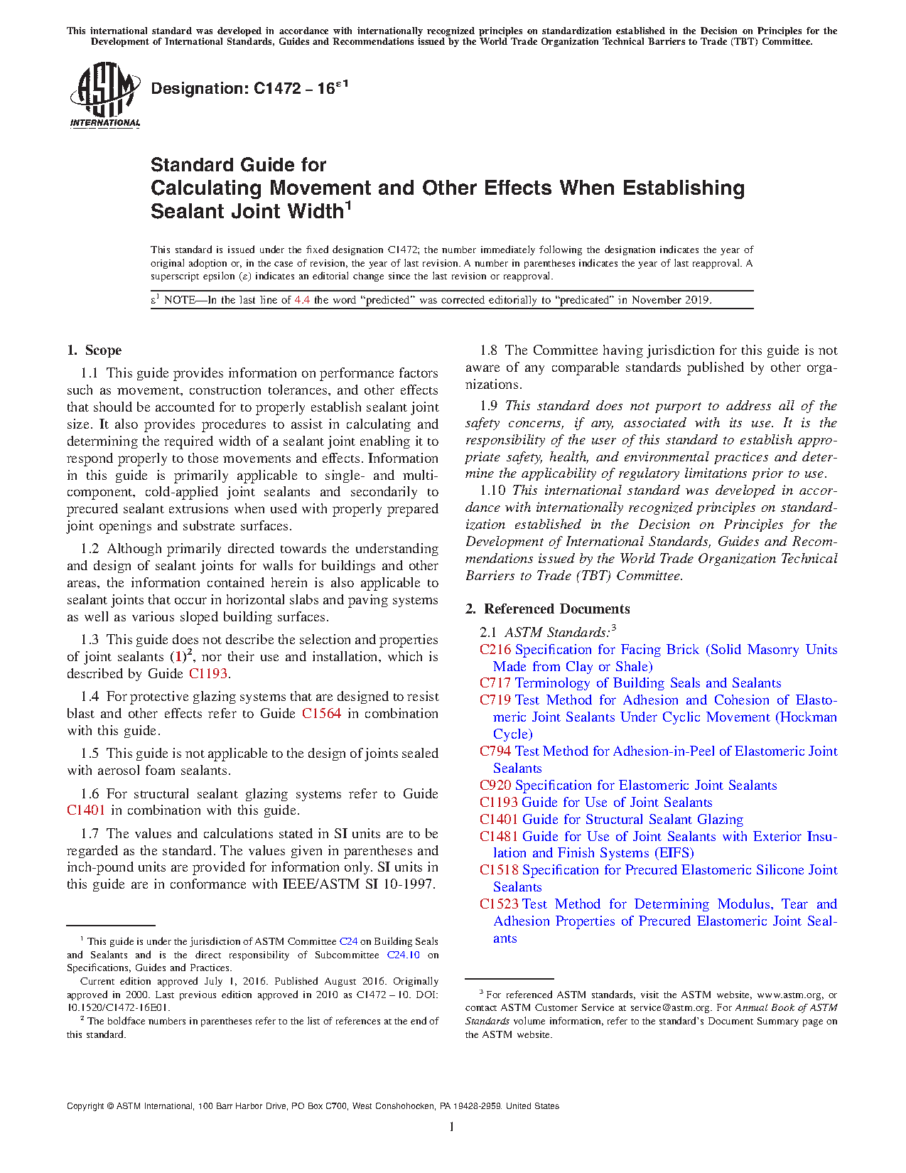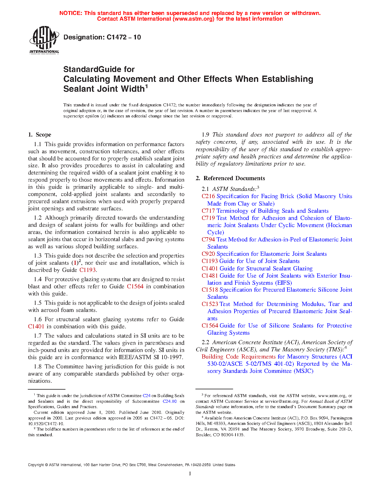 1.3 This guide does not describe the selection and properties of joint sealants (1)2, nor their use and installation, which is described by Guide C1193.