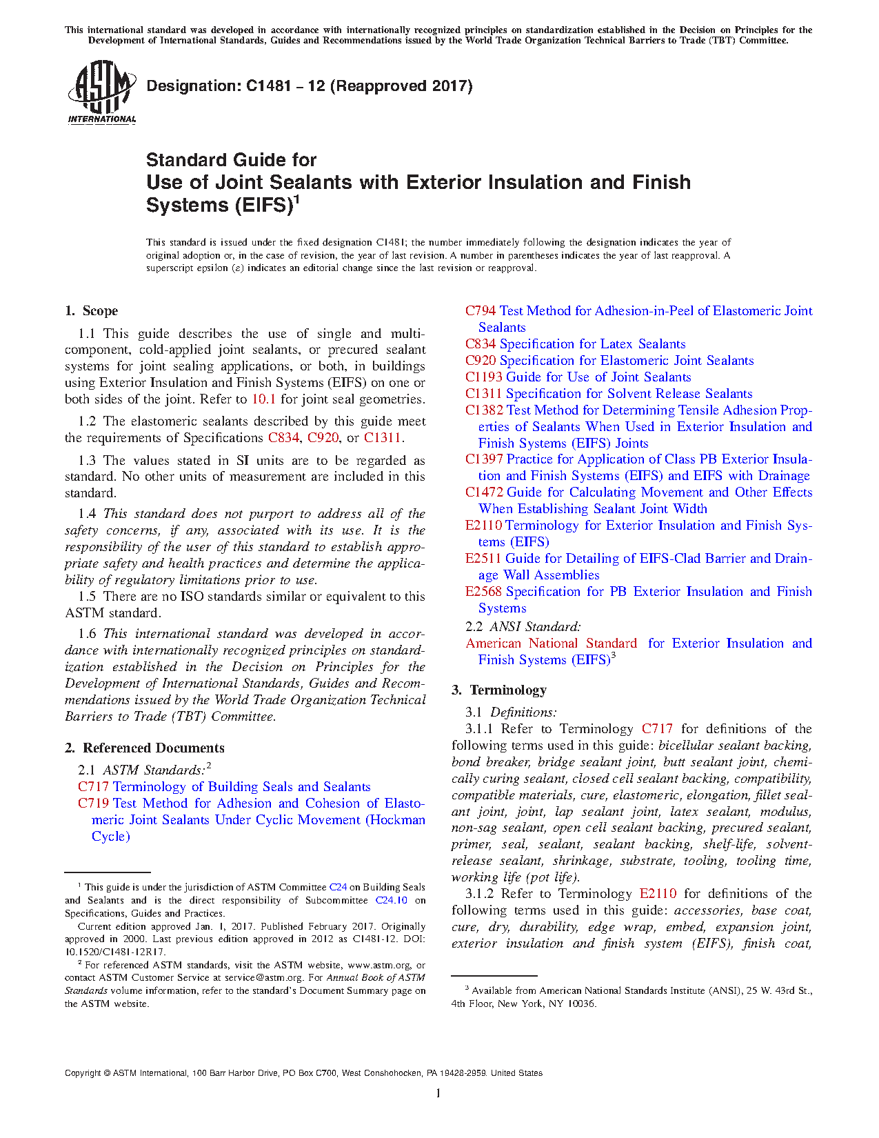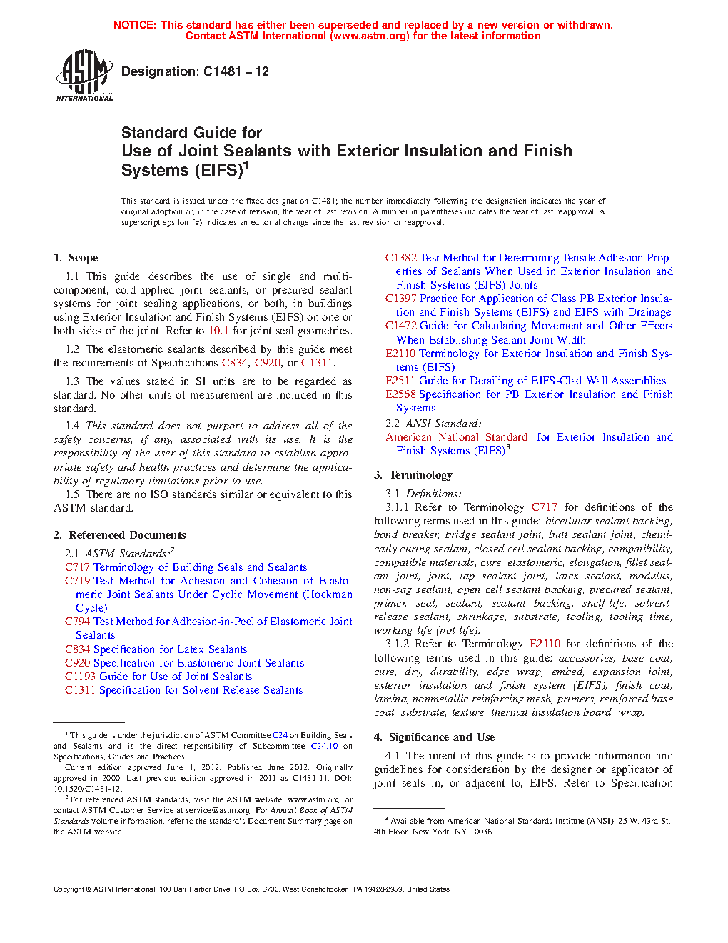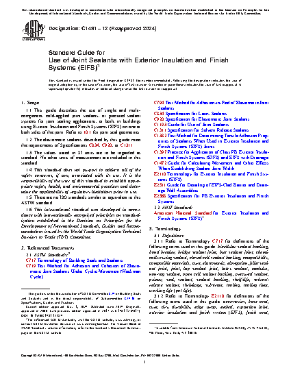 1.1 This guide describes the use of single and multi-component, cold-applied joint sealants, or precured sealant systems for joint sealing applications, or both, in buildings using Exterior Insulation and Finish Systems (EIFS) on one or both sides of the joint. Refer to 10.1 for joint seal geometries.