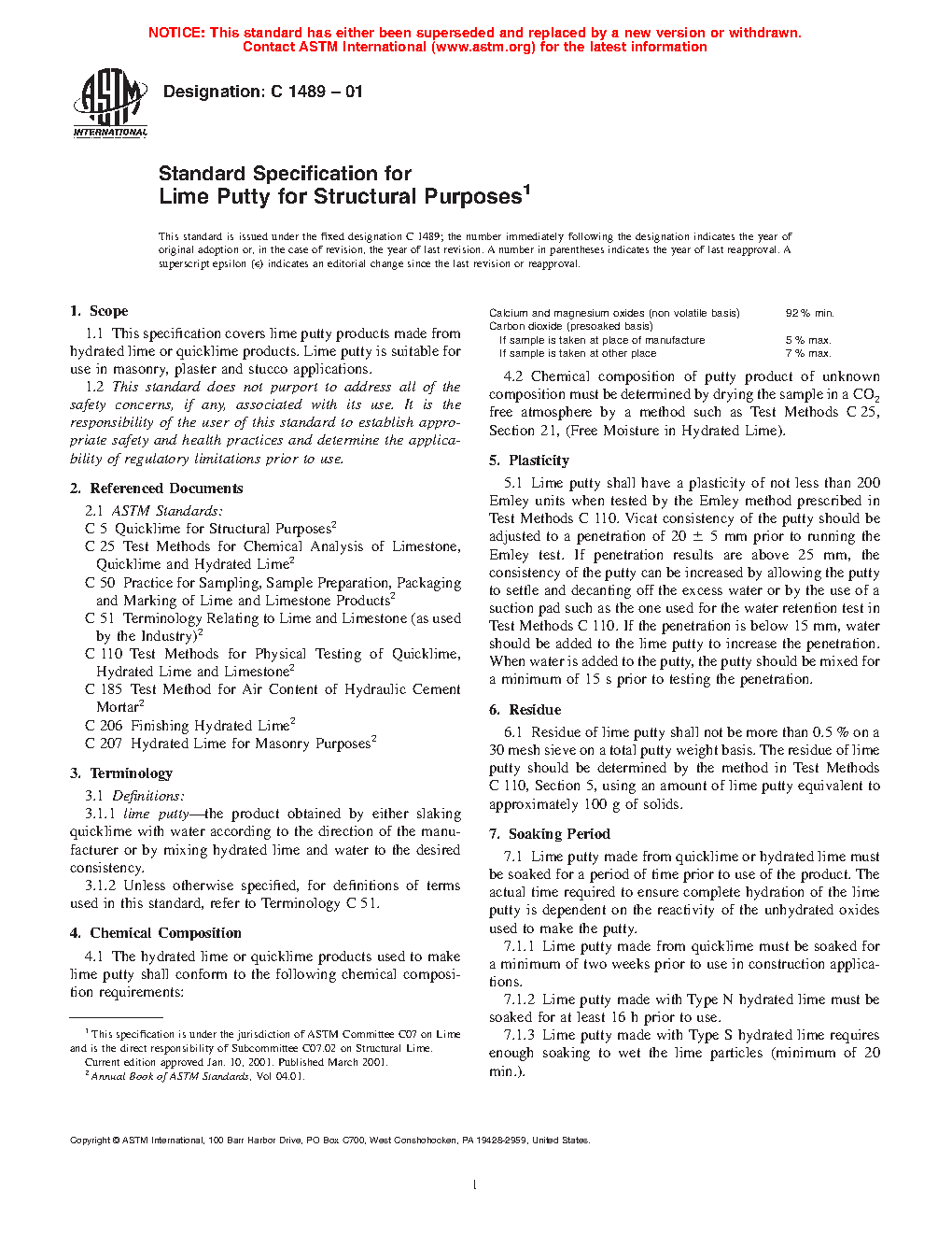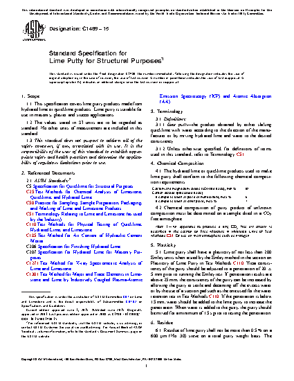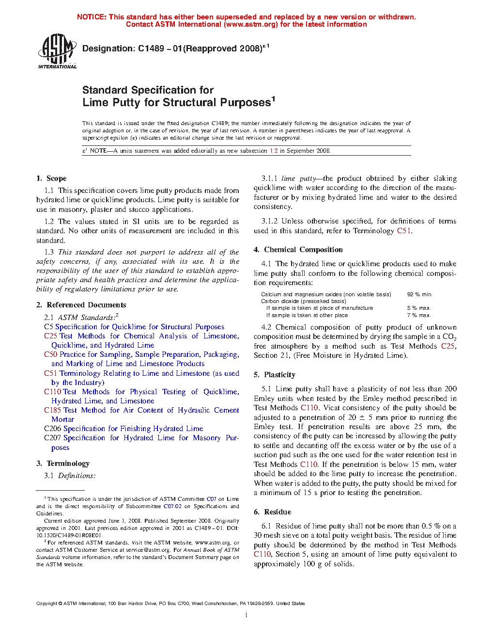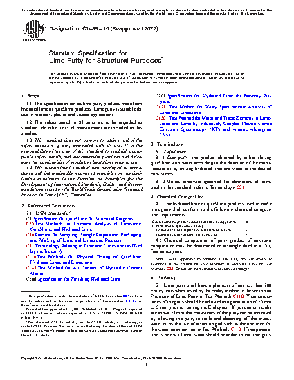This specification covers lime putty products made from hydrated lime or quicklime products. Lime putty is suitable for use in masonry, plaster and stucco applications. The hydrated lime or quicklime products used to make lime putty shall be tested and shall conform to the chemical composition, plasticity, residue, soaking period, popping and pitting, and density requirements specified.