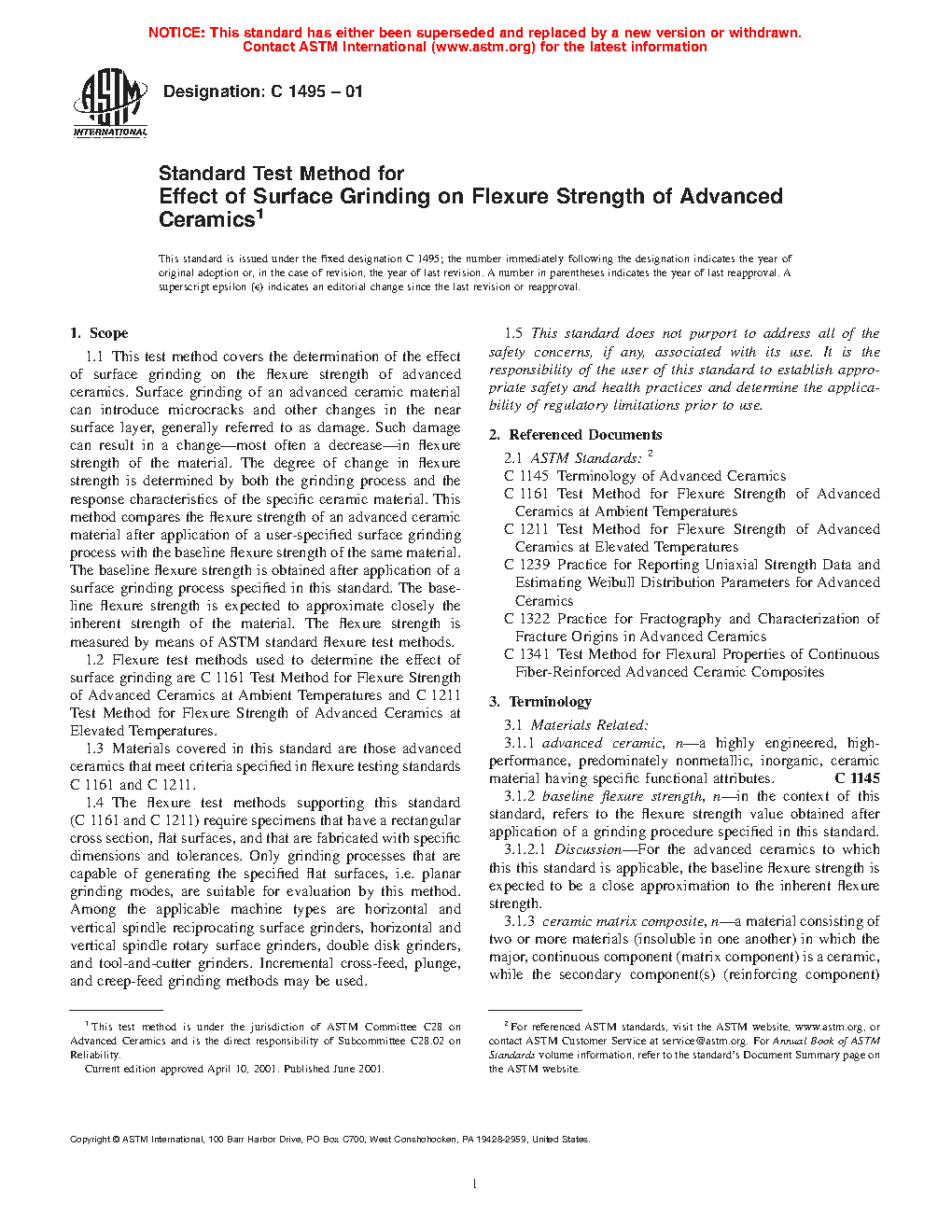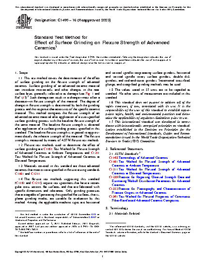 1.2 Flexure test methods used to determine the effect of surface grinding are C1161 Test Method for Flexure Strength of Advanced Ceramics at Ambient Temperatures and C1211 Test Method for Flexure Strength of Advanced Ceramics at Elevated Temperatures.