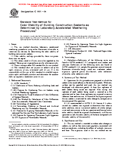 1.1 This test method describes laboratory accelerated weathering procedures using either fluorescent ultraviolet or xenon arc test devices for determining the color stability of building construction sealants.