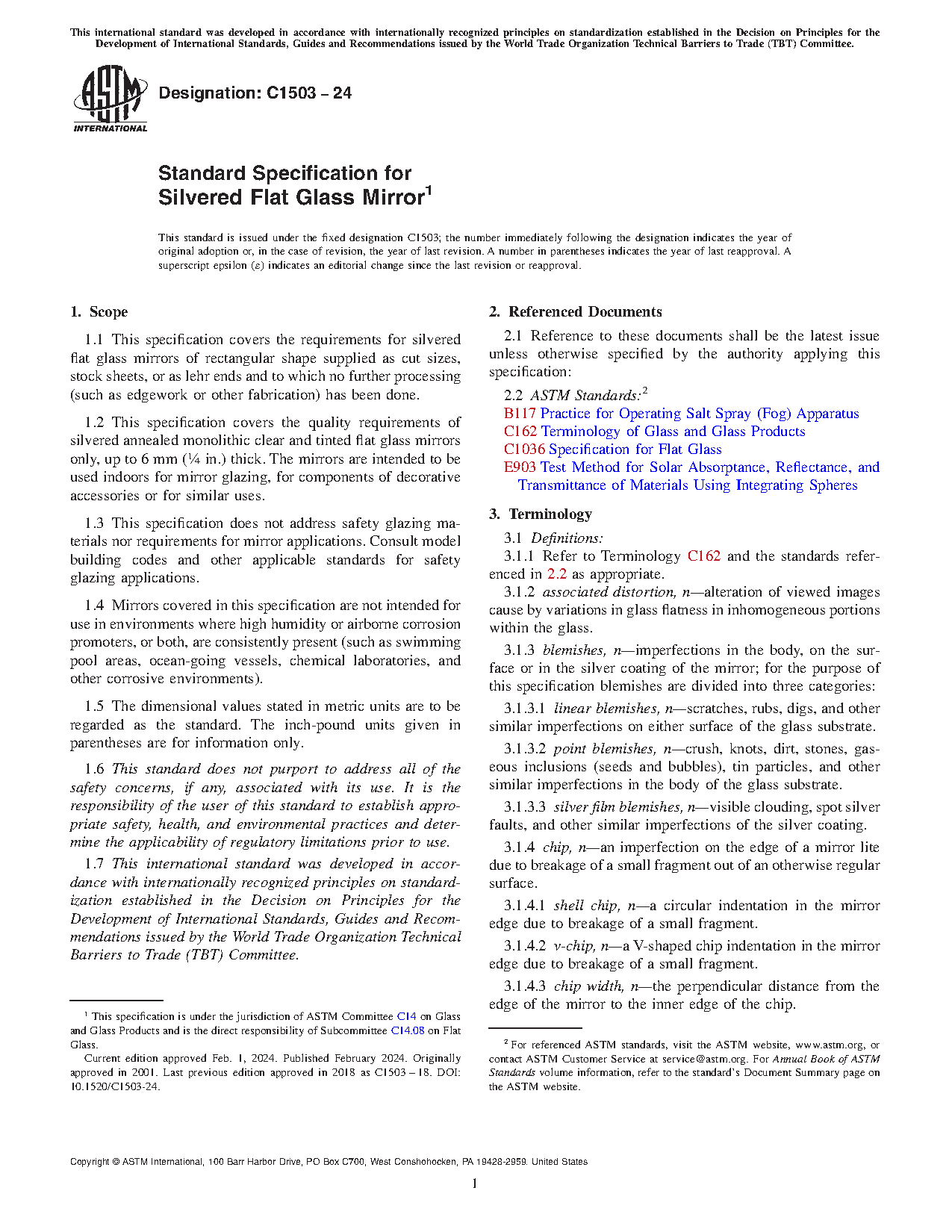 This specification covers the requirements for silvered flat glass mirrors of rectangular shape supplied as cut sizes, stock sheets or as lehr ends and to which no further processing (such as edgework or other fabrication) has been done. The quality requirements of silvered annealed monolithic clear and tinted flat glass mirrors up to a certain thickness are also discussed. The mirrors are intended to be used indoors for mirror glazing, for components of decorative accessories or for similar uses. The mirrors are not intended for use in environments where high humidity or airborne corrosion promoters, or both, are consistently present (such as swimming pool areas, ocean-going vessels, chemical laboratories and other corrosive environments). The classification of mirrors are according to the following properties: grades, cut size, stock sheet, lehr end, select quality, glazing quality, color (clear or tinted), and thickness. Different test methods shall be performed in order to determine or measure the following properties: reflectance, silver coating appearance, coating resistance, blemish (point and linear blemishes), dimension, and squareness.